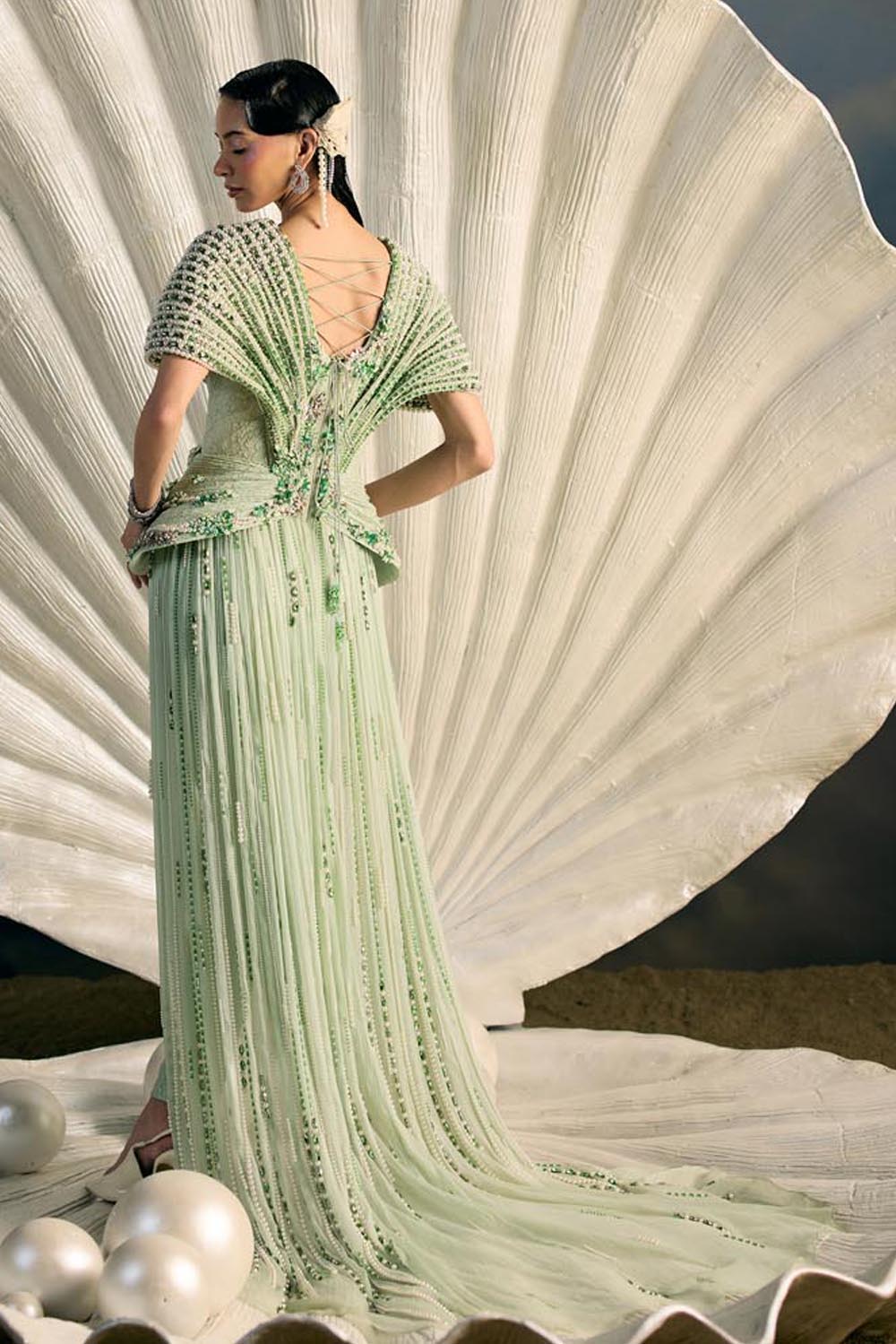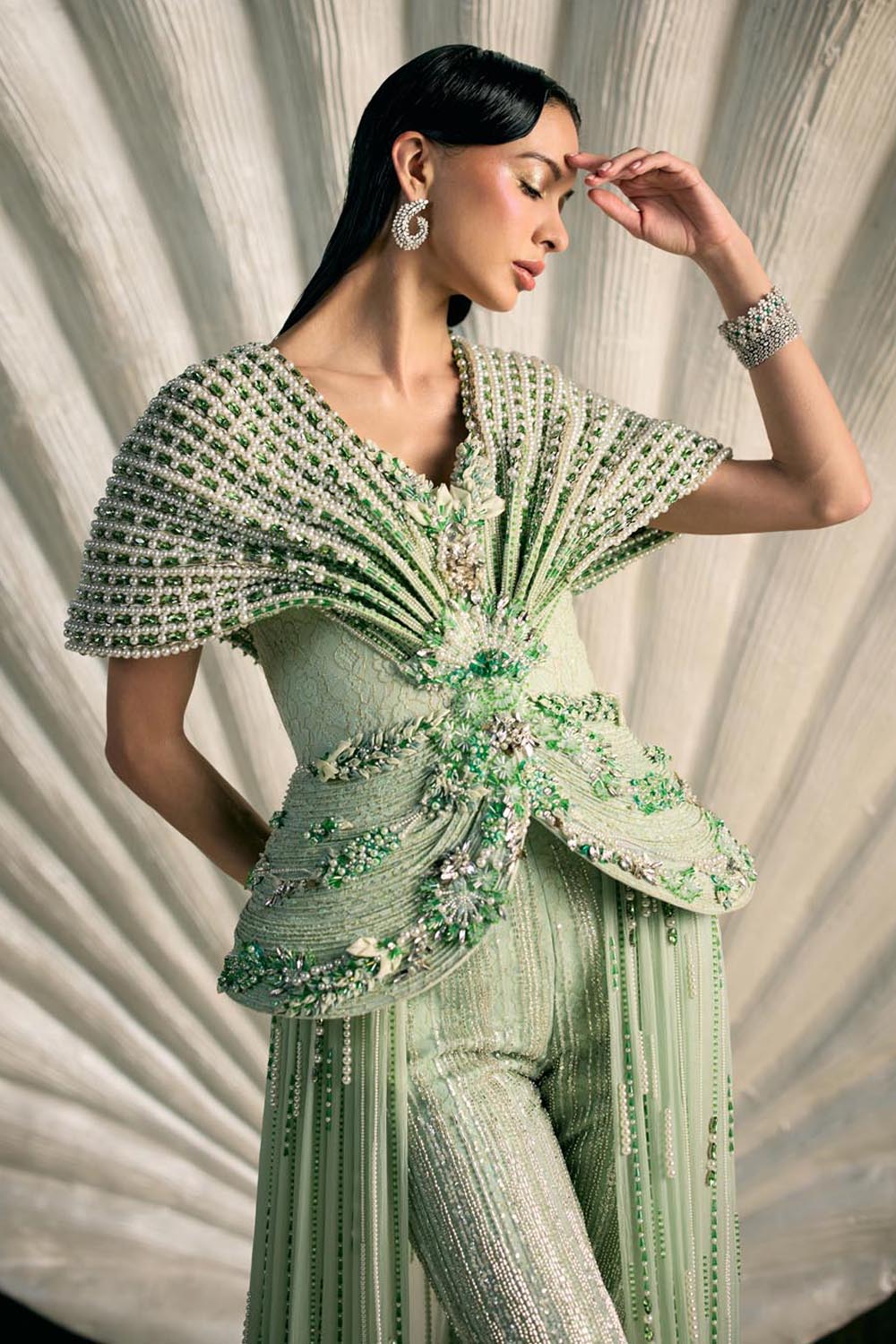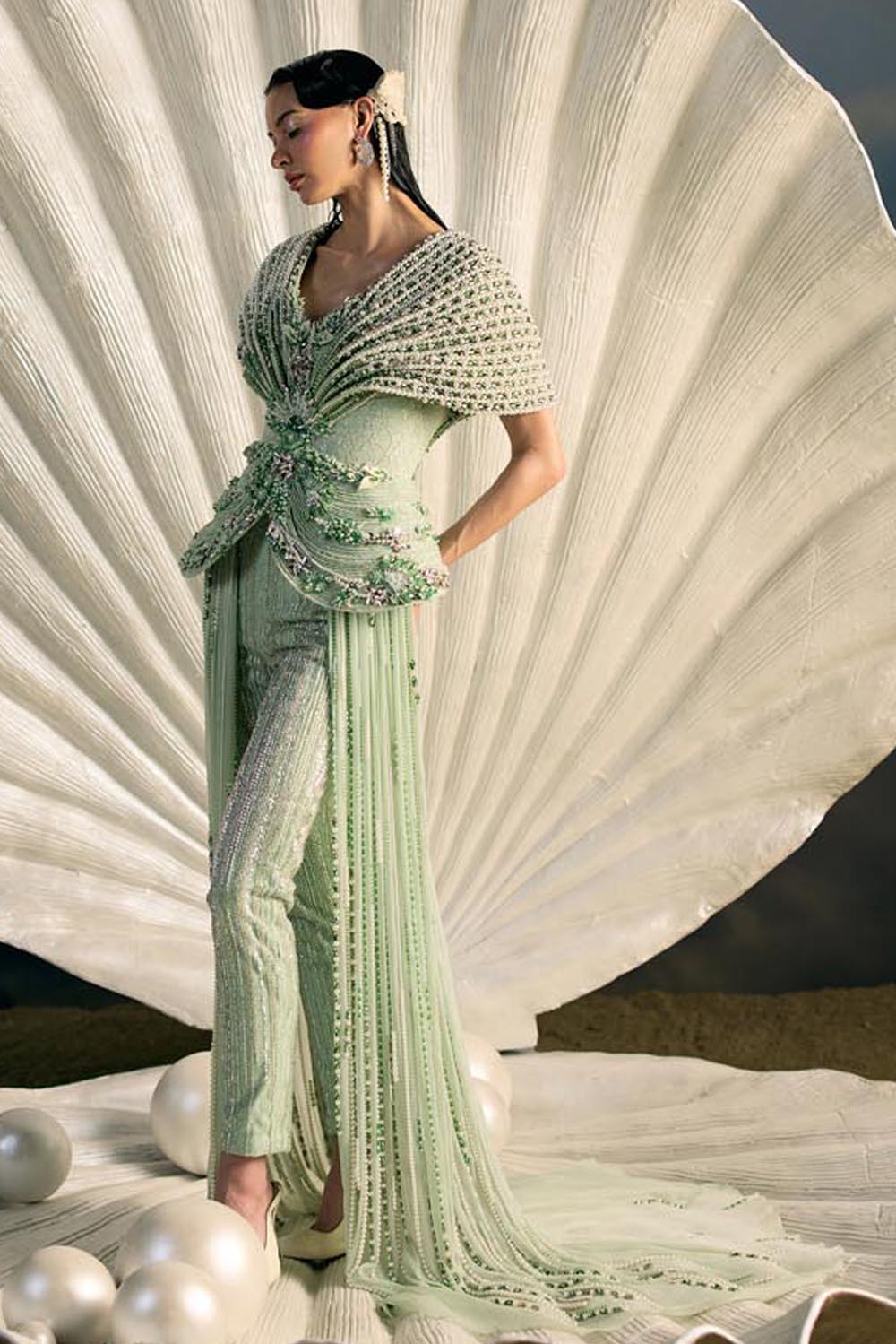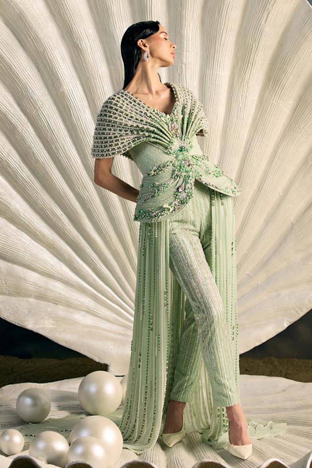 A Maison H couture statement, this pastel seafoam pant-gown marries structure and fluidity. A peplum-inspired blouse with a crystalline waist accent extends into cascading panels, embroidered in shell-lattice motifs. Straight trousers balance the dramatic drape, while the trailing panels shimmer with sequins and beads, evoking underwater elegance. Designed for the modern muse, it is a look that commands presence with effortless sophistication.