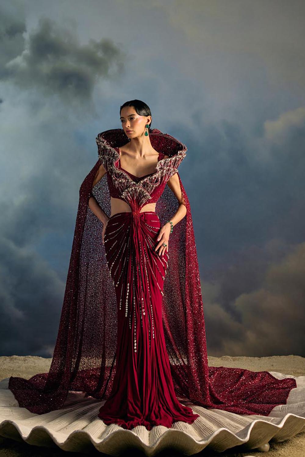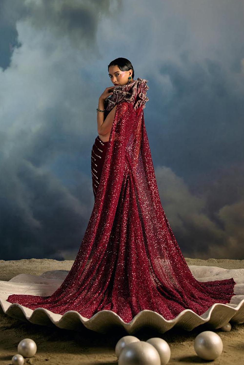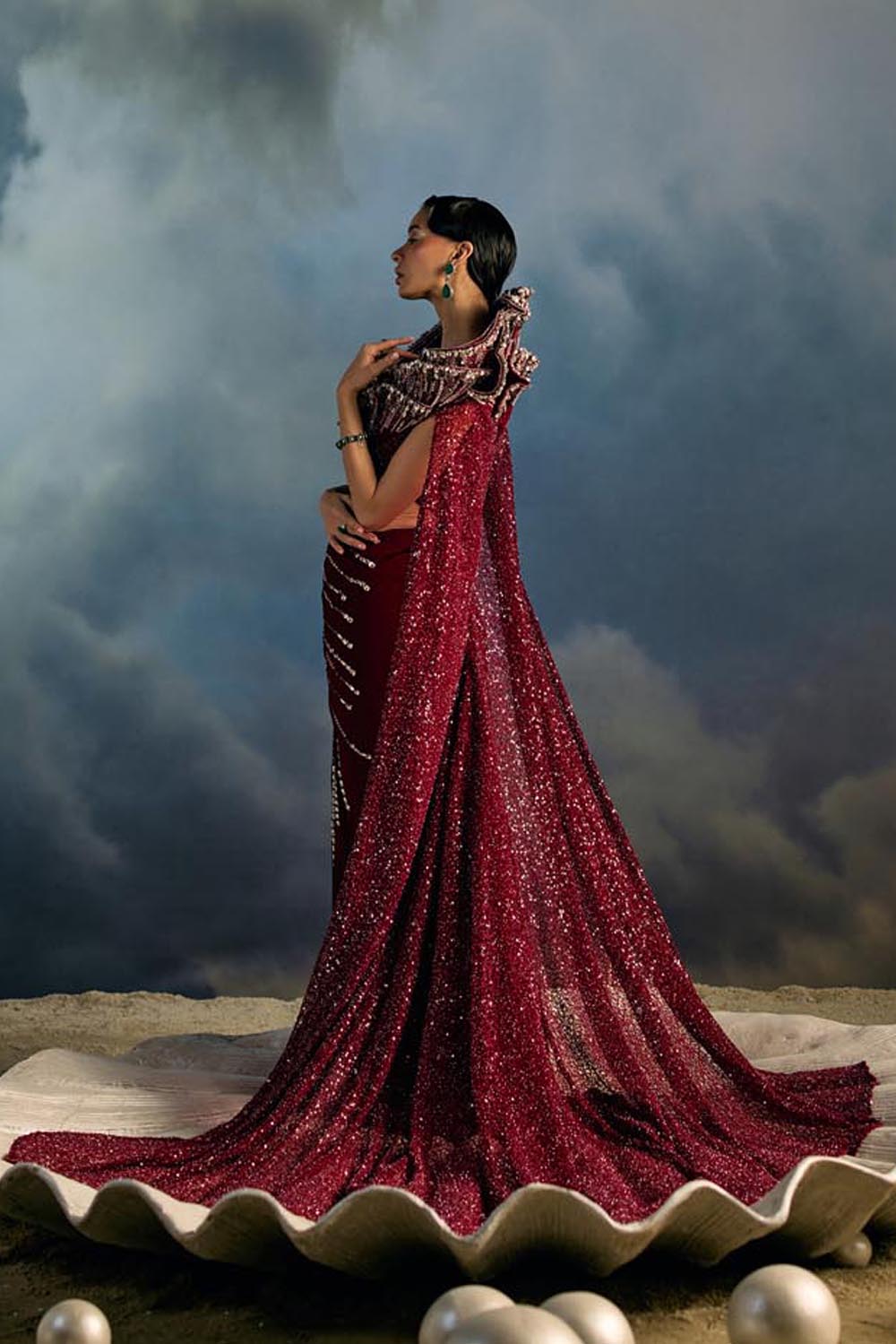 Rouge Abyss is Maison H’s fearless ode to power dressing in couture. A sculpted draped saree gown hugs the form, its waist radiating beams of sequinned embroidery like light piercing the tide. The dramatic winged collar rises into a crystal-encrusted reef, cascading into a full cape that trails with unmatched grandeur. This is a garment for the muse who does not just enter a room and she claims it like the ocean claims the shore.