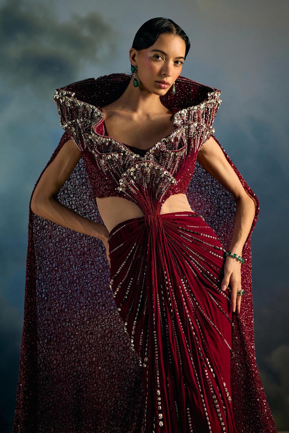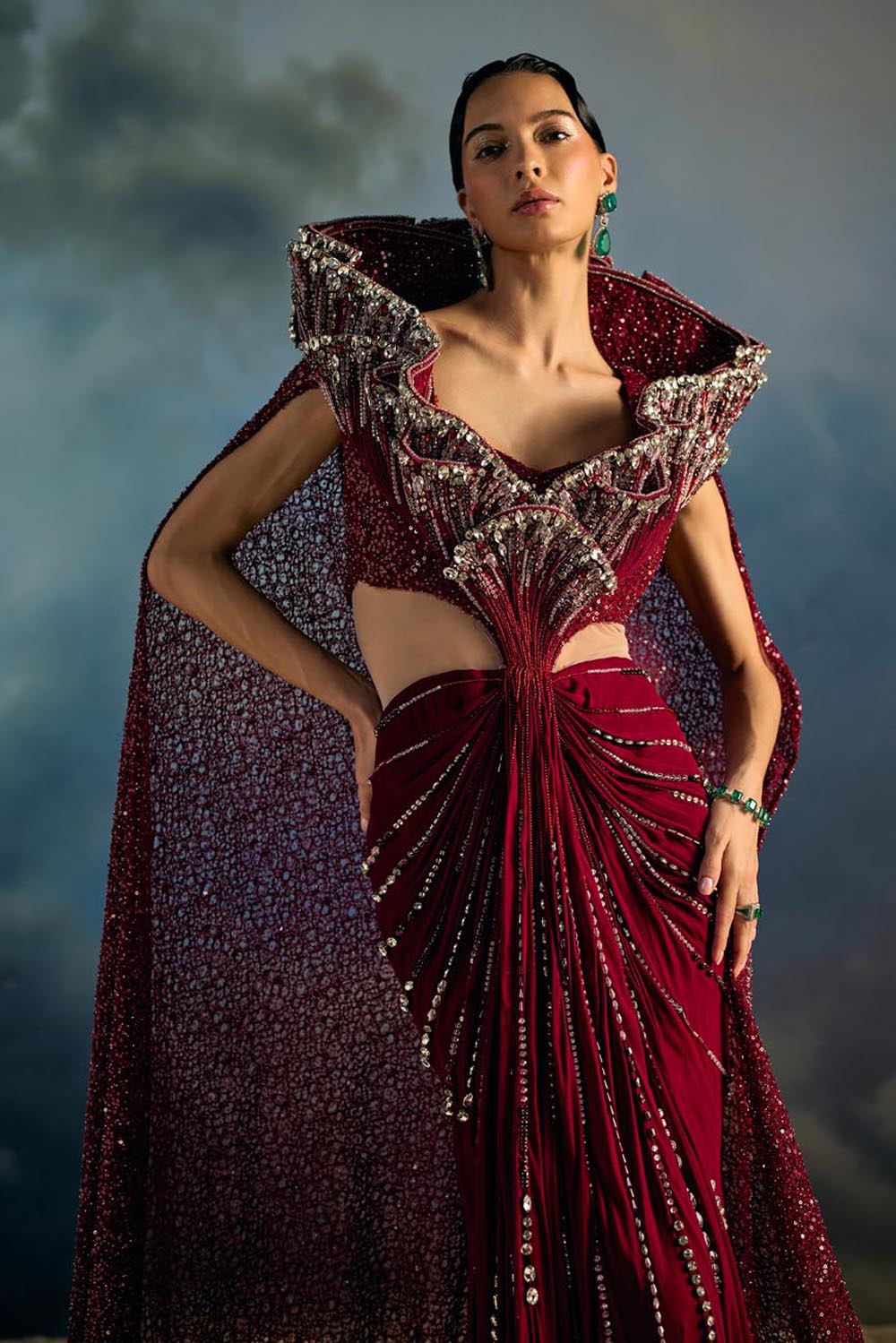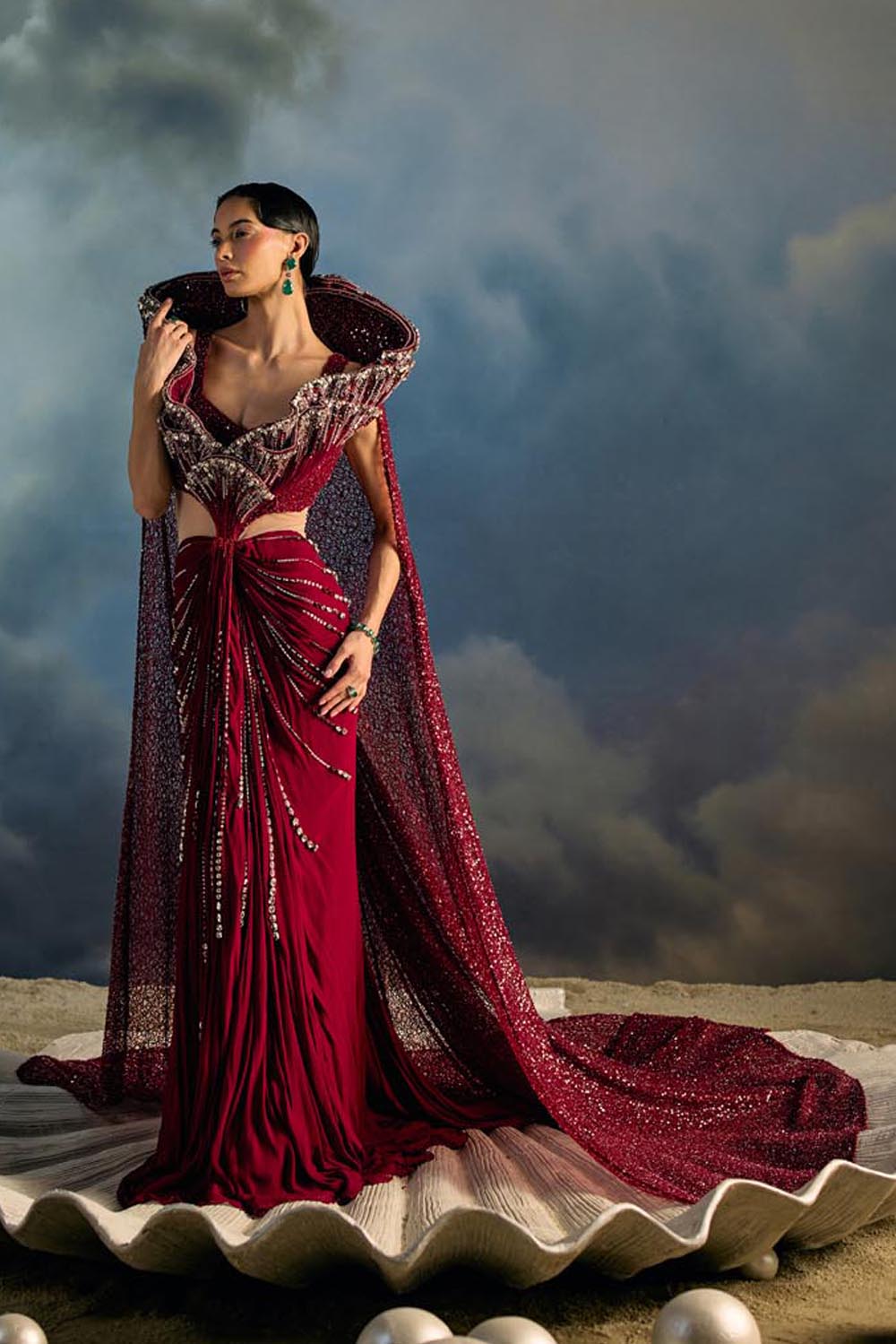 Rouge Abyss is Maison H’s fearless ode to power dressing in couture. A sculpted draped saree gown hugs the form, its waist radiating beams of sequinned embroidery like light piercing the tide. The dramatic winged collar rises into a crystal-encrusted reef, cascading into a full cape that trails with unmatched grandeur. This is a garment for the muse who does not just enter a room and she claims it like the ocean claims the shore.