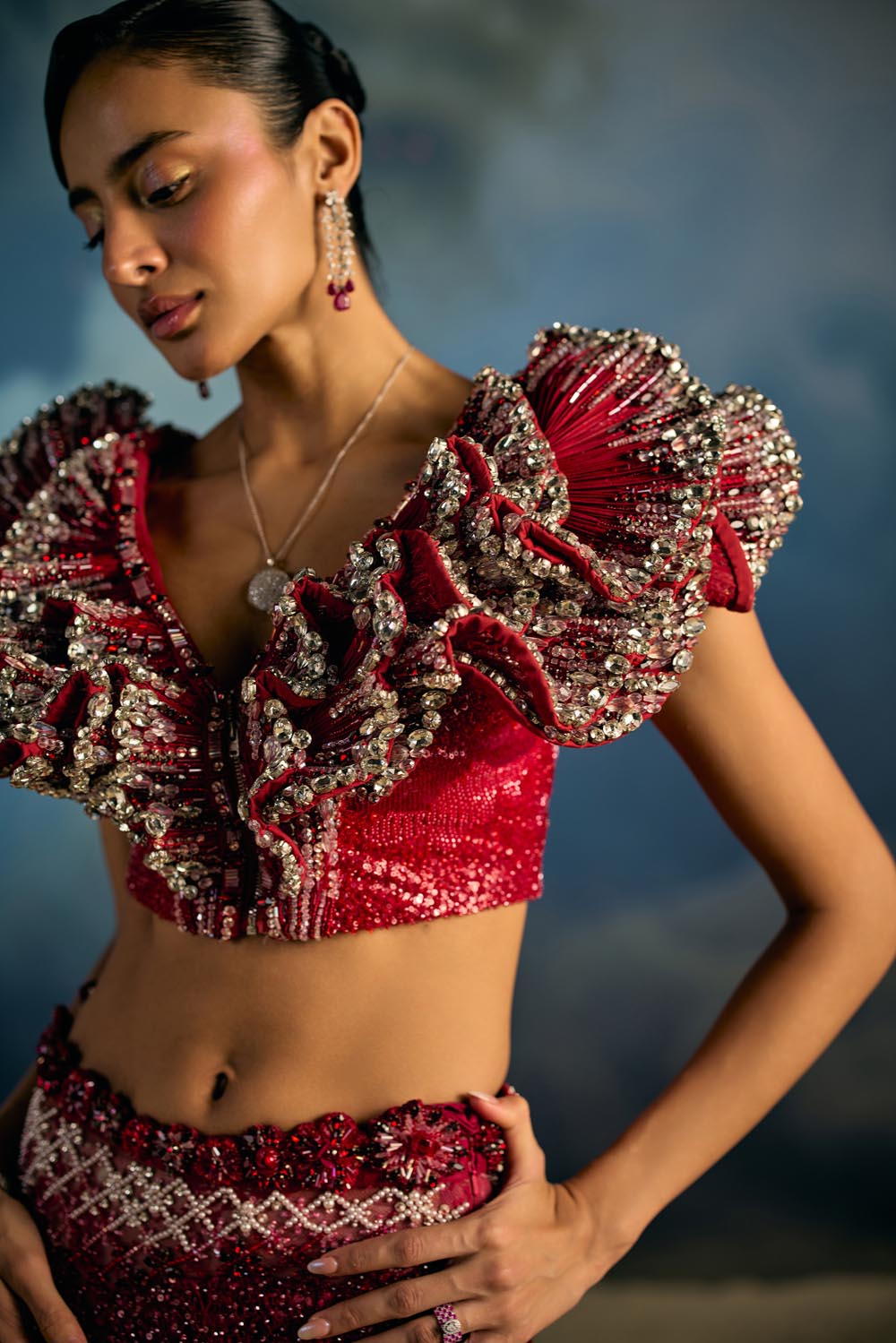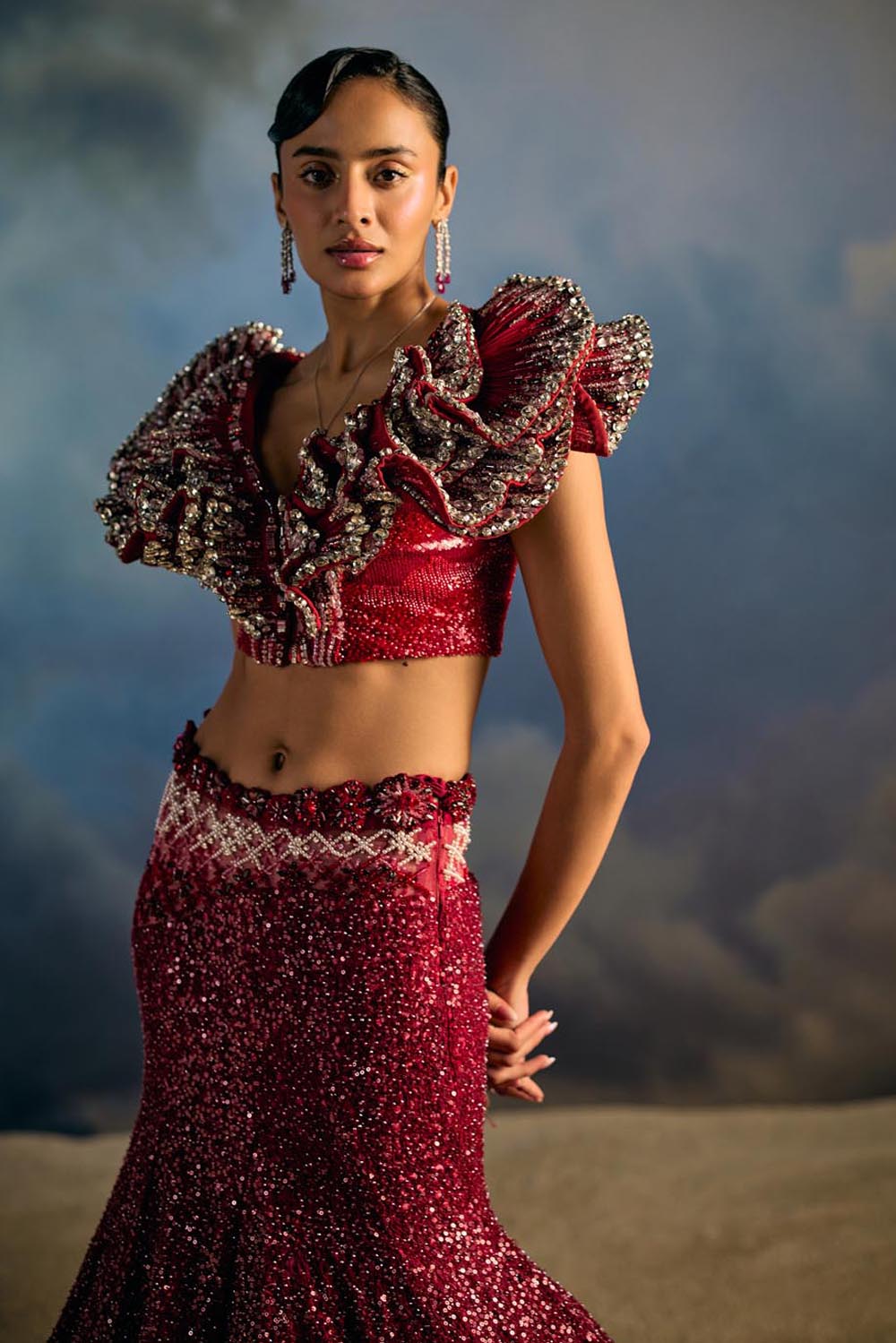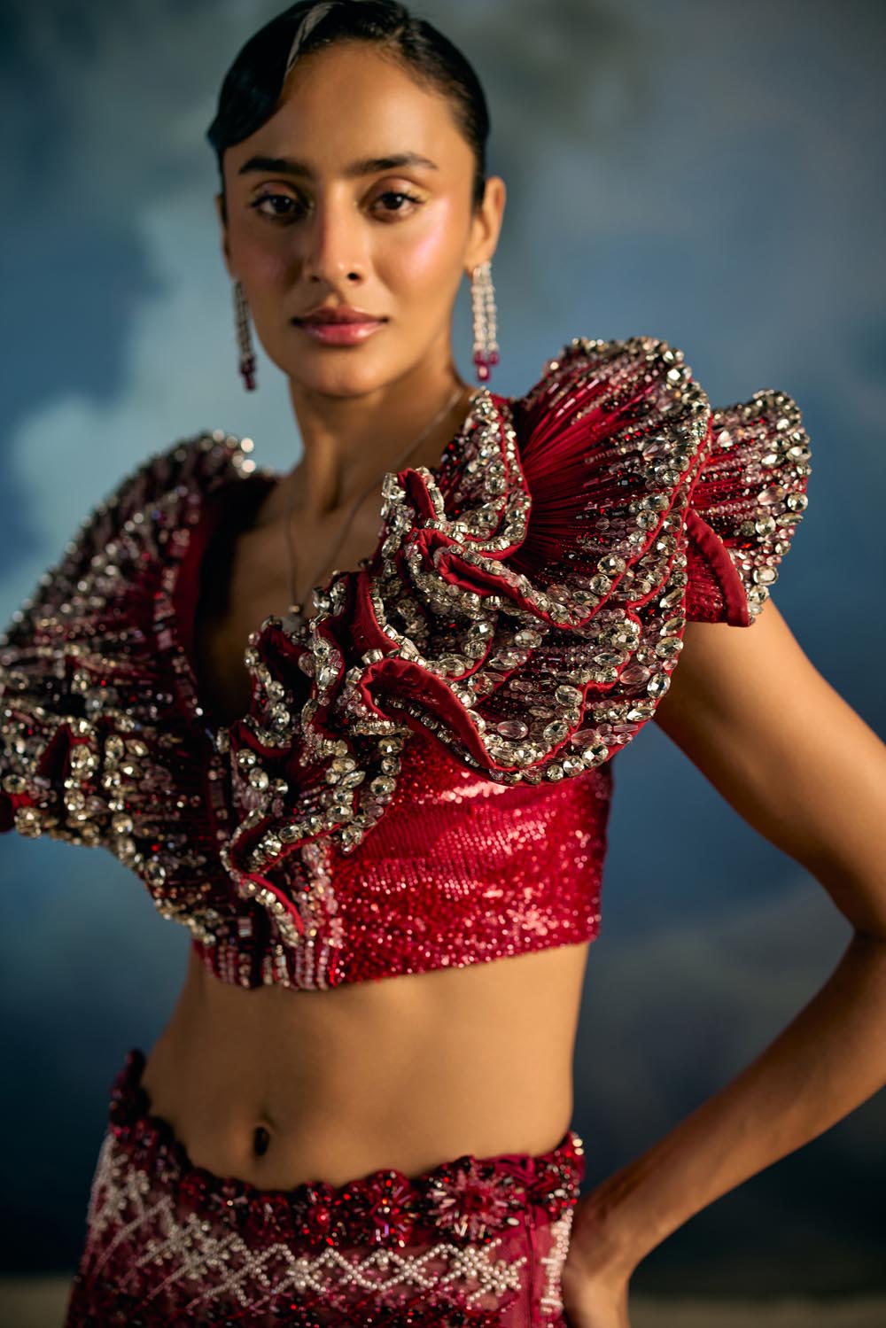 Embroidery: The lehenga is encrusted with ombré embroidery, transitioning from deep rouge at the waist to silver-pearl shimmer at the hem, created through sequins, beads, and crystals in layered density. The blouse wings are embroidered with heavy clusters of multi-dimensional sequins, bugle beads, and pearls, forming a coral-like, almost shell-ruffled texture that crowns the silhouette with couture drama.