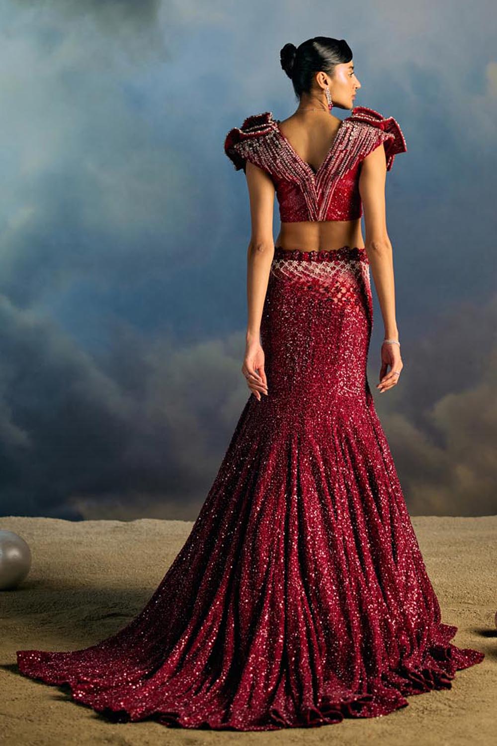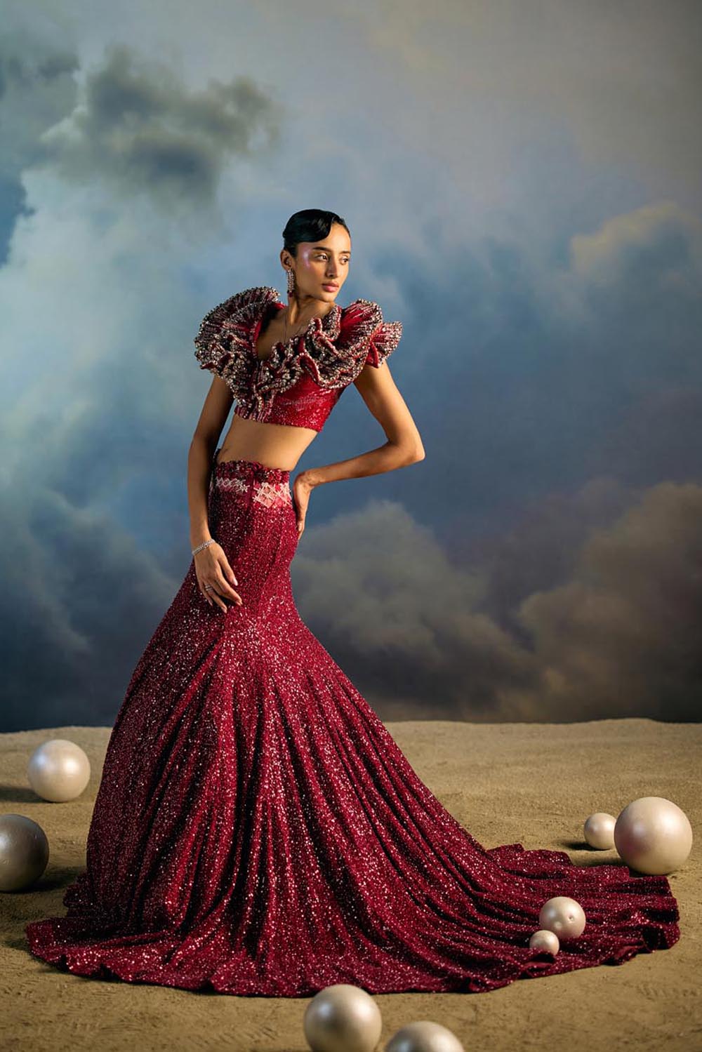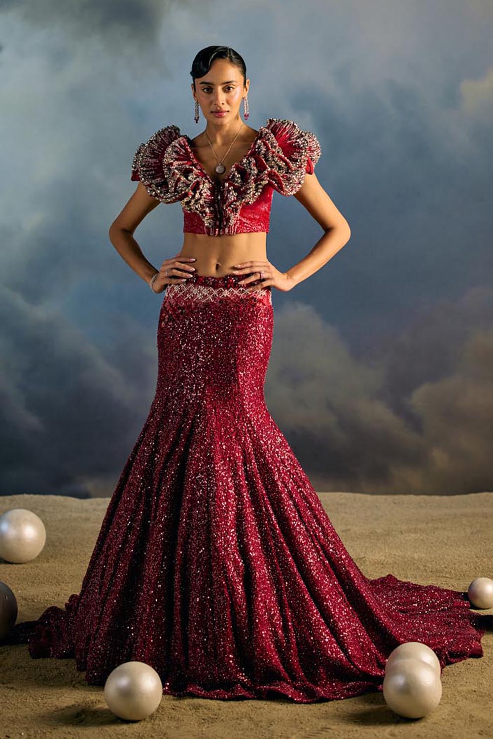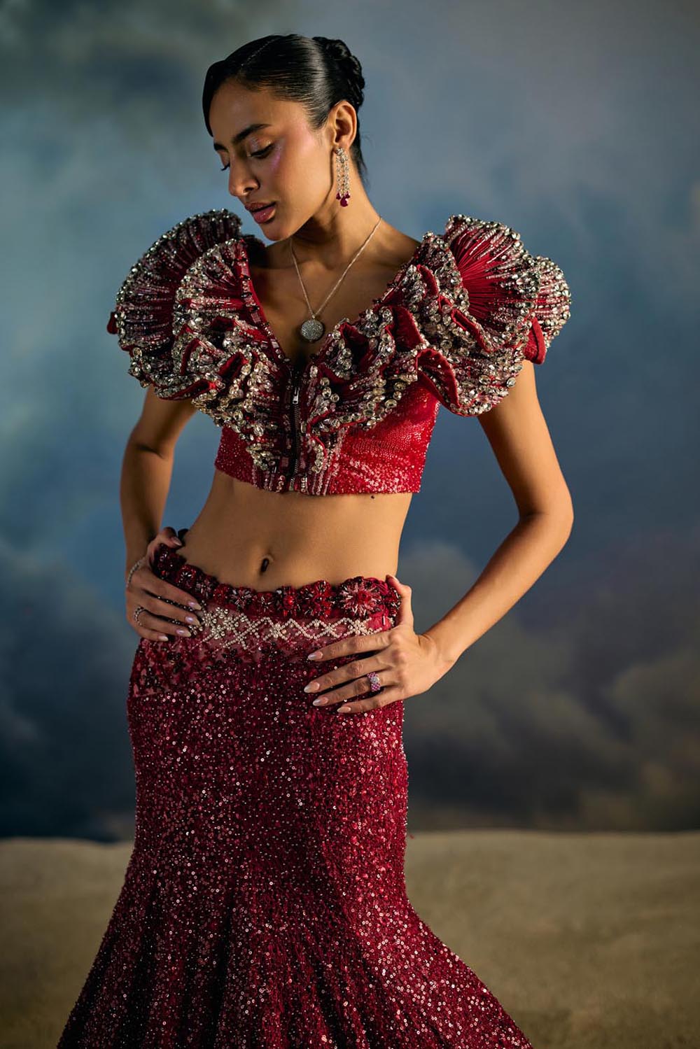 Embroidery: The lehenga is encrusted with ombré embroidery, transitioning from deep rouge at the waist to silver-pearl shimmer at the hem, created through sequins, beads, and crystals in layered density. The blouse wings are embroidered with heavy clusters of multi-dimensional sequins, bugle beads, and pearls, forming a coral-like, almost shell-ruffled texture that crowns the silhouette with couture drama.