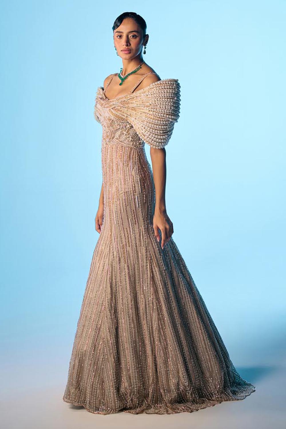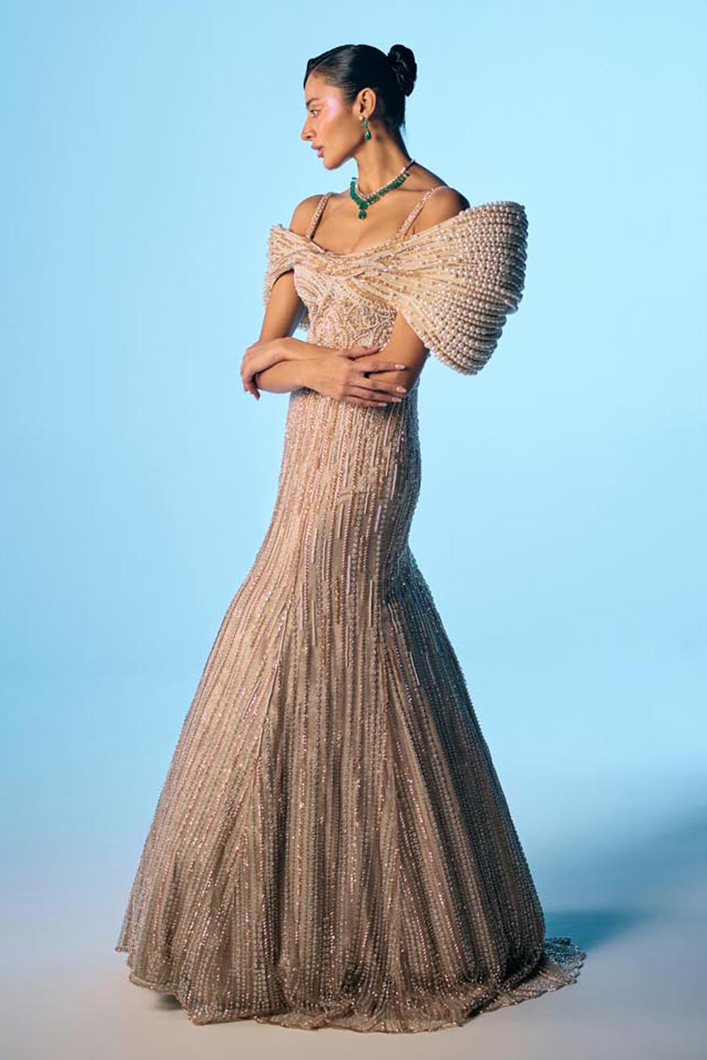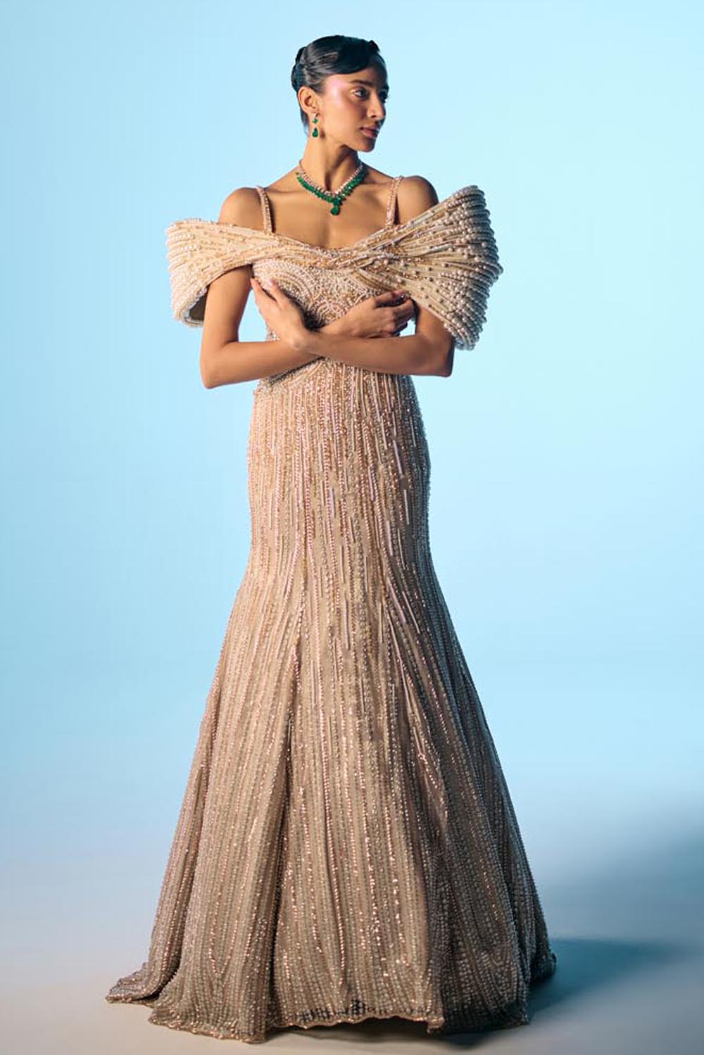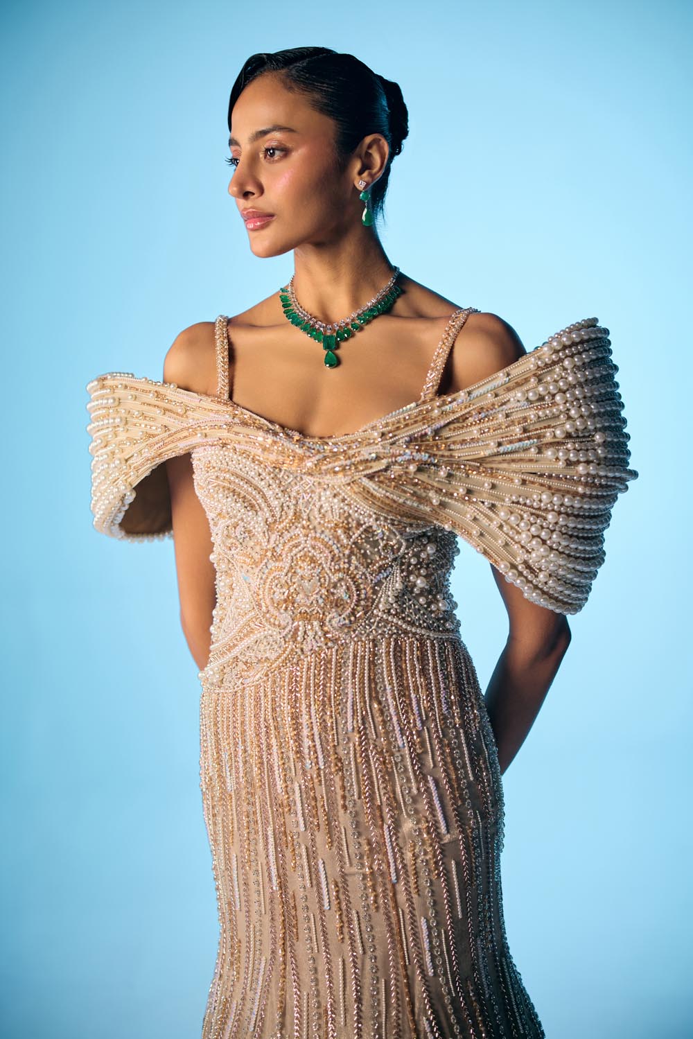 Embroidery: The gown is fully adorned with linear embroidery in sequins, beads, and crystals, cascading vertically to elongate the body. The embroidery density shifts around the bust and waist, sculpting the figure, while the winged off-shoulder fold is densely encrusted to create a textural contrast against the smooth linear shimmer of the skirt.