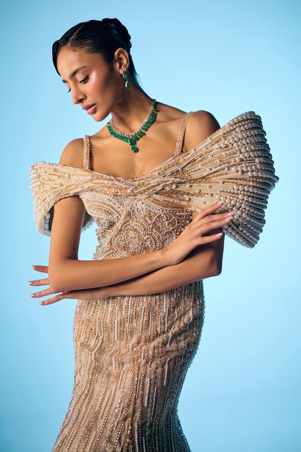 Champagne Gold Radiance is a Maison H ode to sculpted elegance where architecture meets fluid light. The mermaid gown gleams with vertical cascades of sequins and crystals, elongating the body like streams of liquid gold. The off-shoulder wing detail, folded with couture precision, crowns the neckline like a shell opening to reveal its pearl. A silhouette crafted for the muse who commands attention not with volume, but with luminous grace.