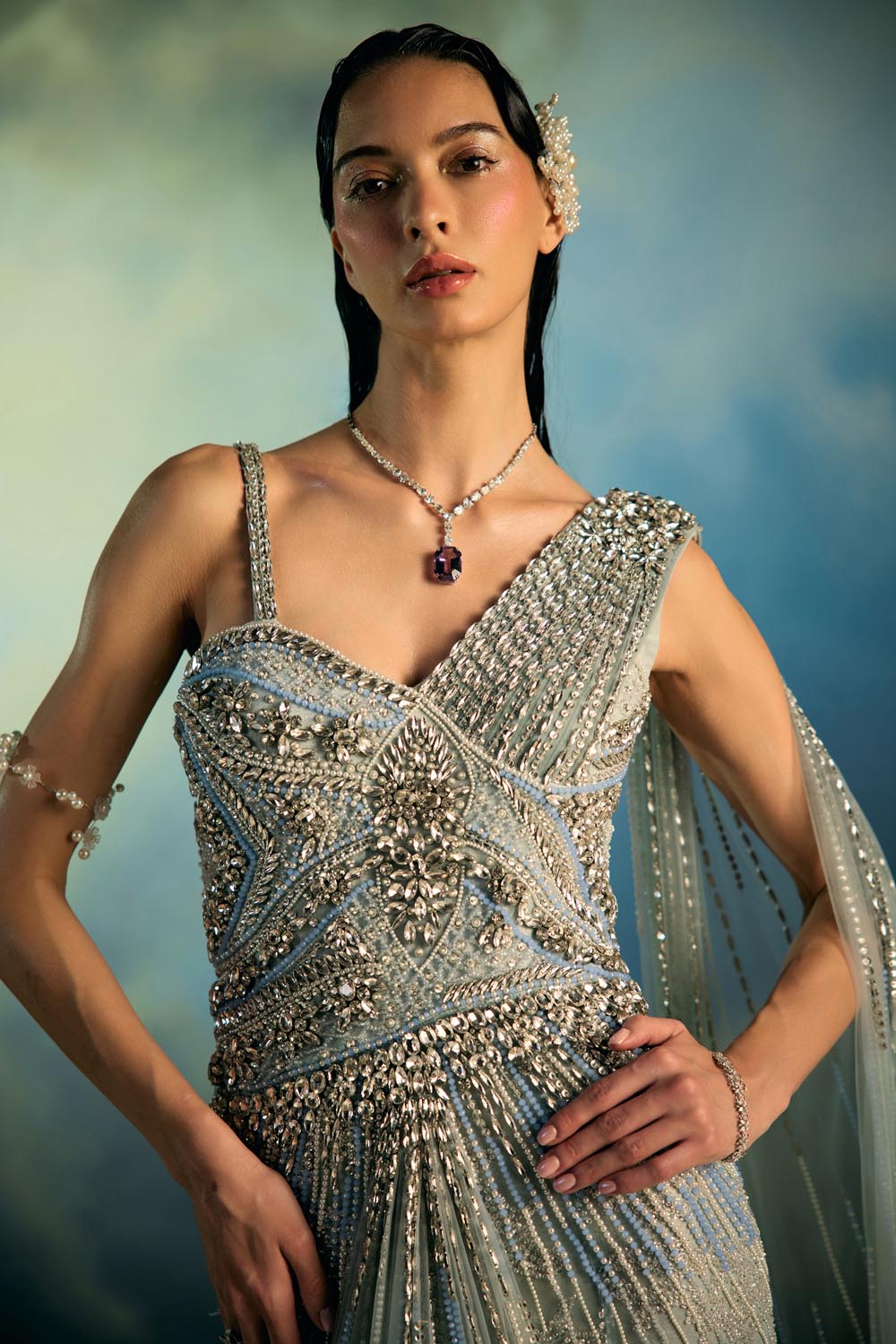 Embroidery: Adorned with multi-dimensional pearls, sequins, and crystals, the embroidery follows fluid, wave-like lines across the bodice. The skirt is detailed with coral-inspired motifs in tonal pastel blue and silver, while the sheer pallu drape sparkles with pearl-beaded tassels, evoking streams of cascading water.