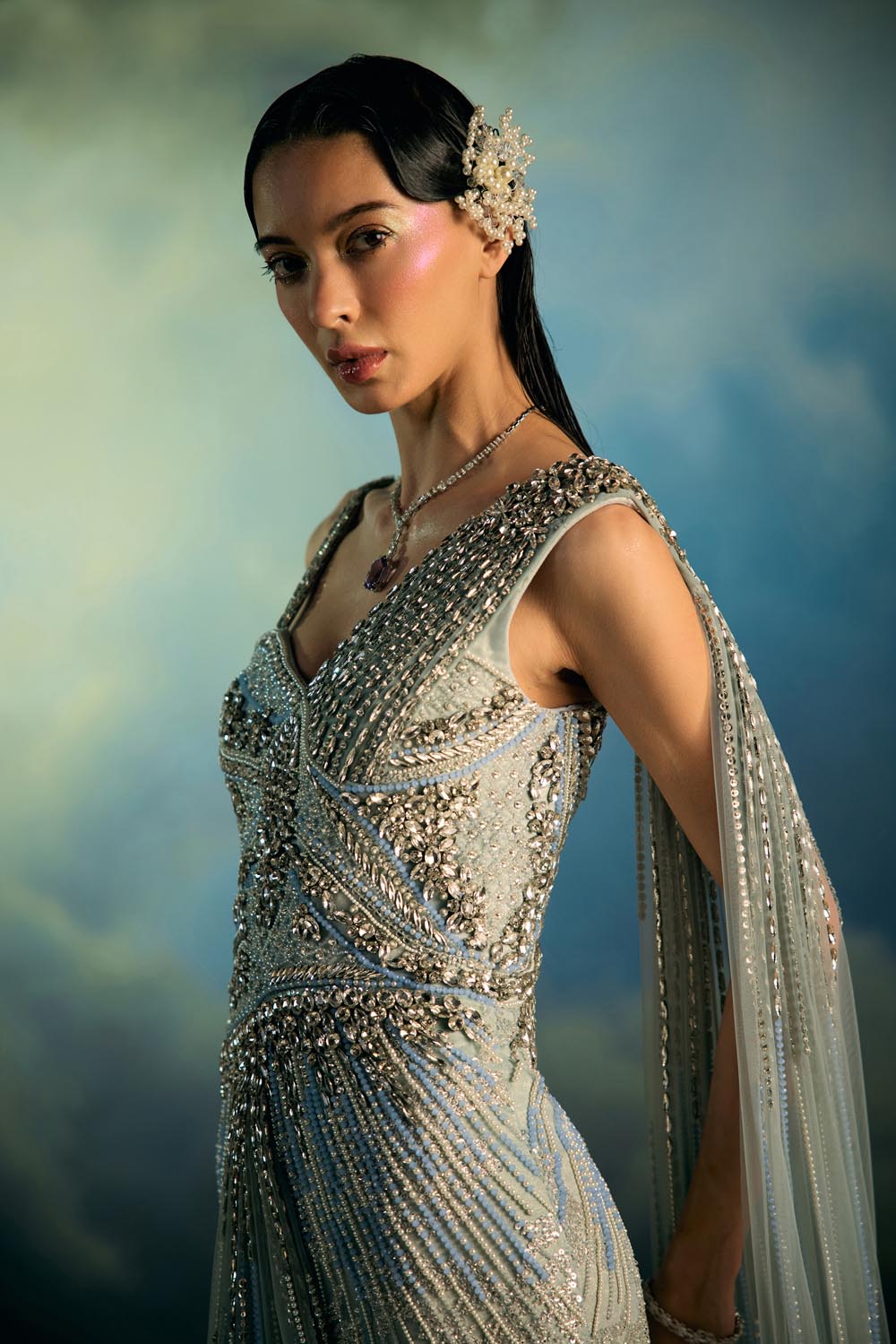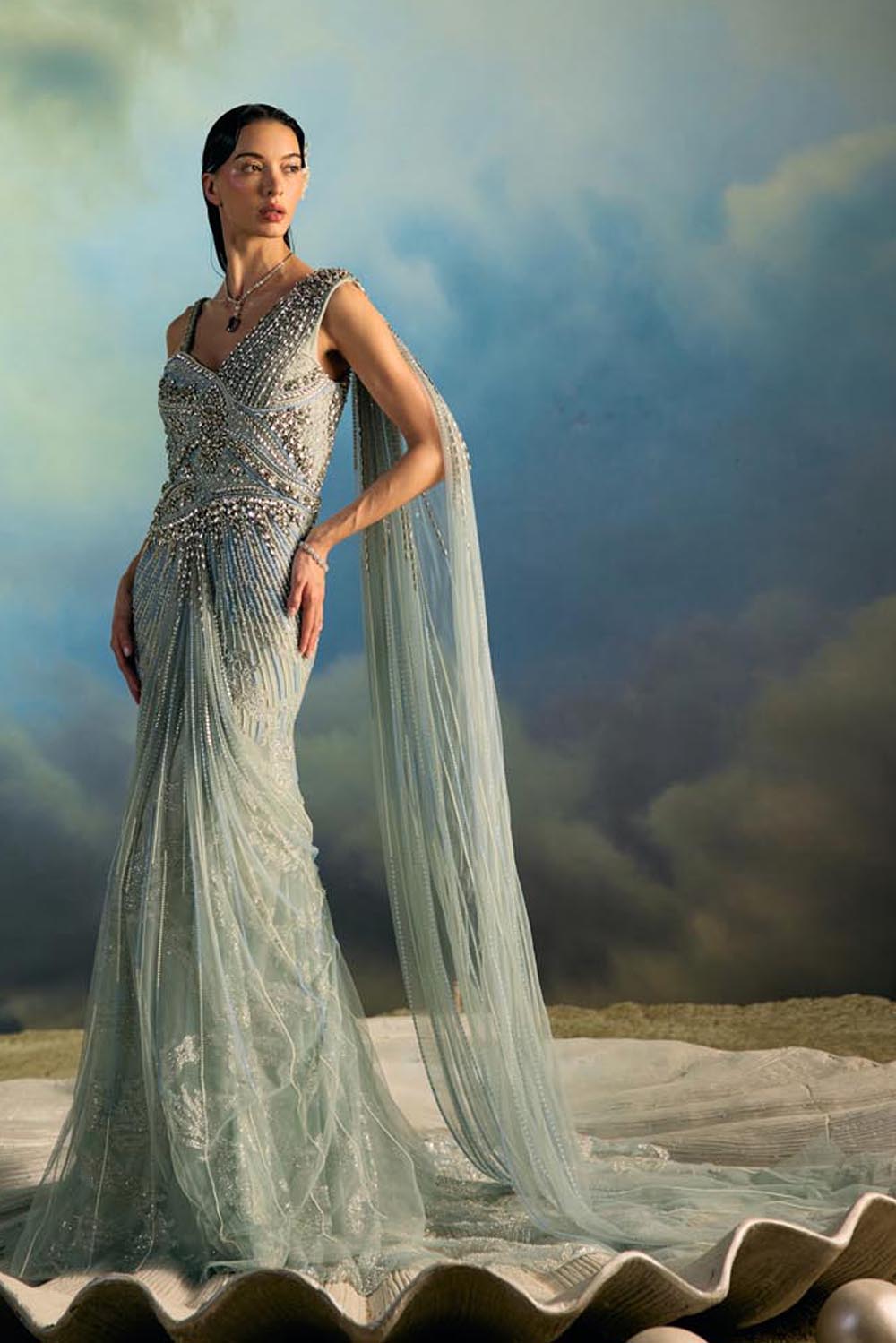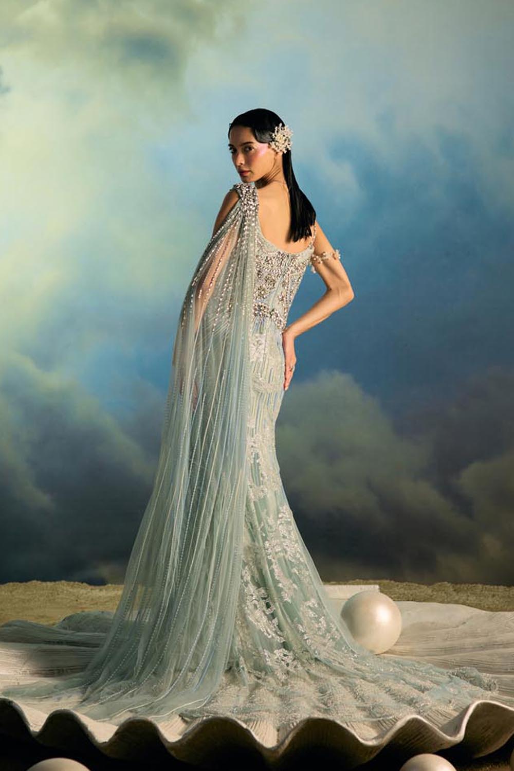 Pastel Blue Seafoam is Maison H’s vision of serenity under the tides, a saree-gown where heritage meets couture fluidity. The mermaid base glistens with pearl and crystal embroidery, while the pastel drape trails from the shoulder like a silken wave. Tassel fringes shimmer as they fall, echoing waterfalls in motion. Ethereal yet bold, this silhouette is crafted for the muse who carries the calm of the sea and the confidence of its depths.