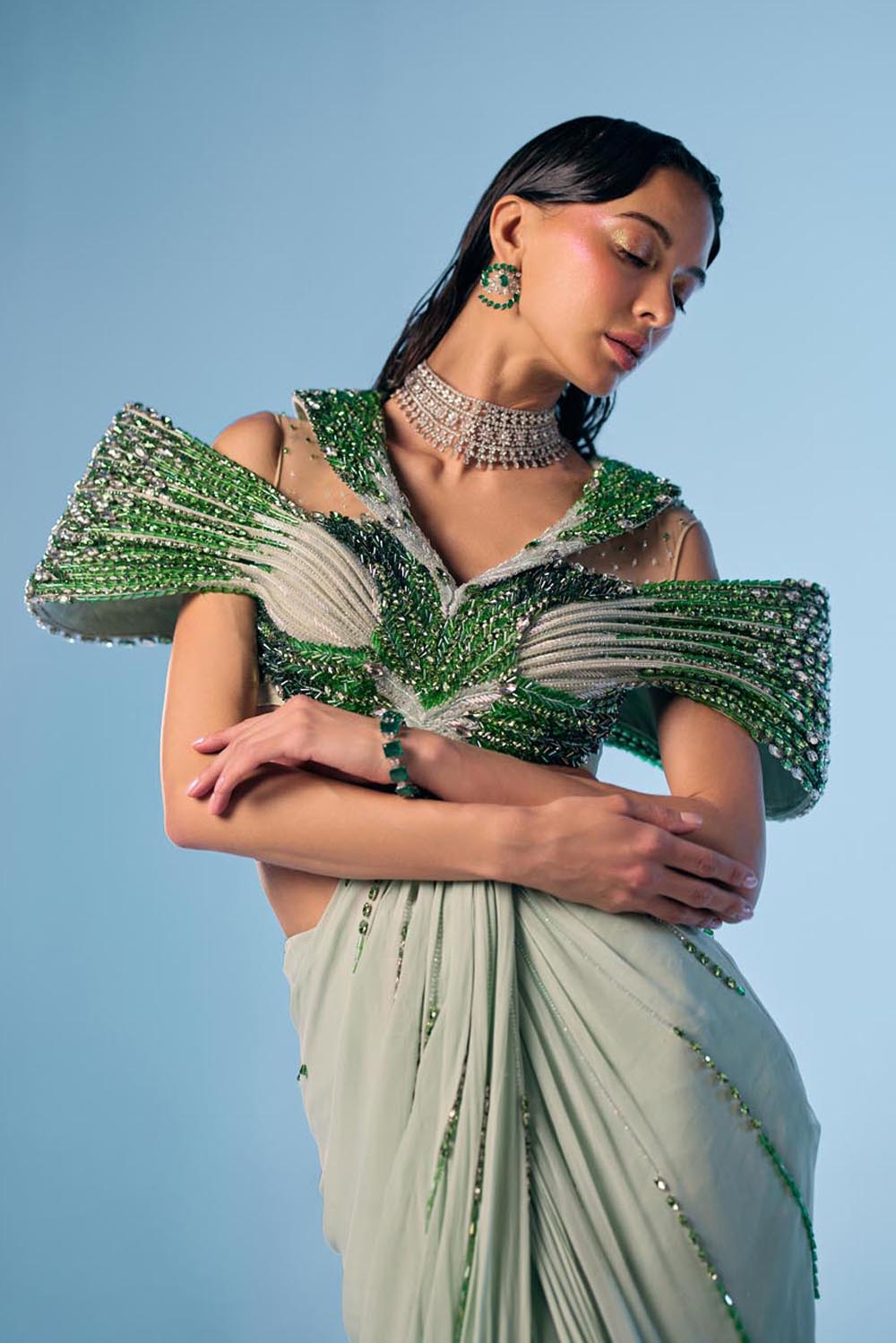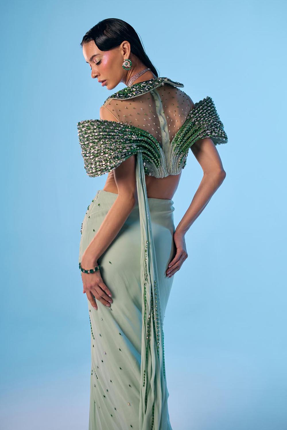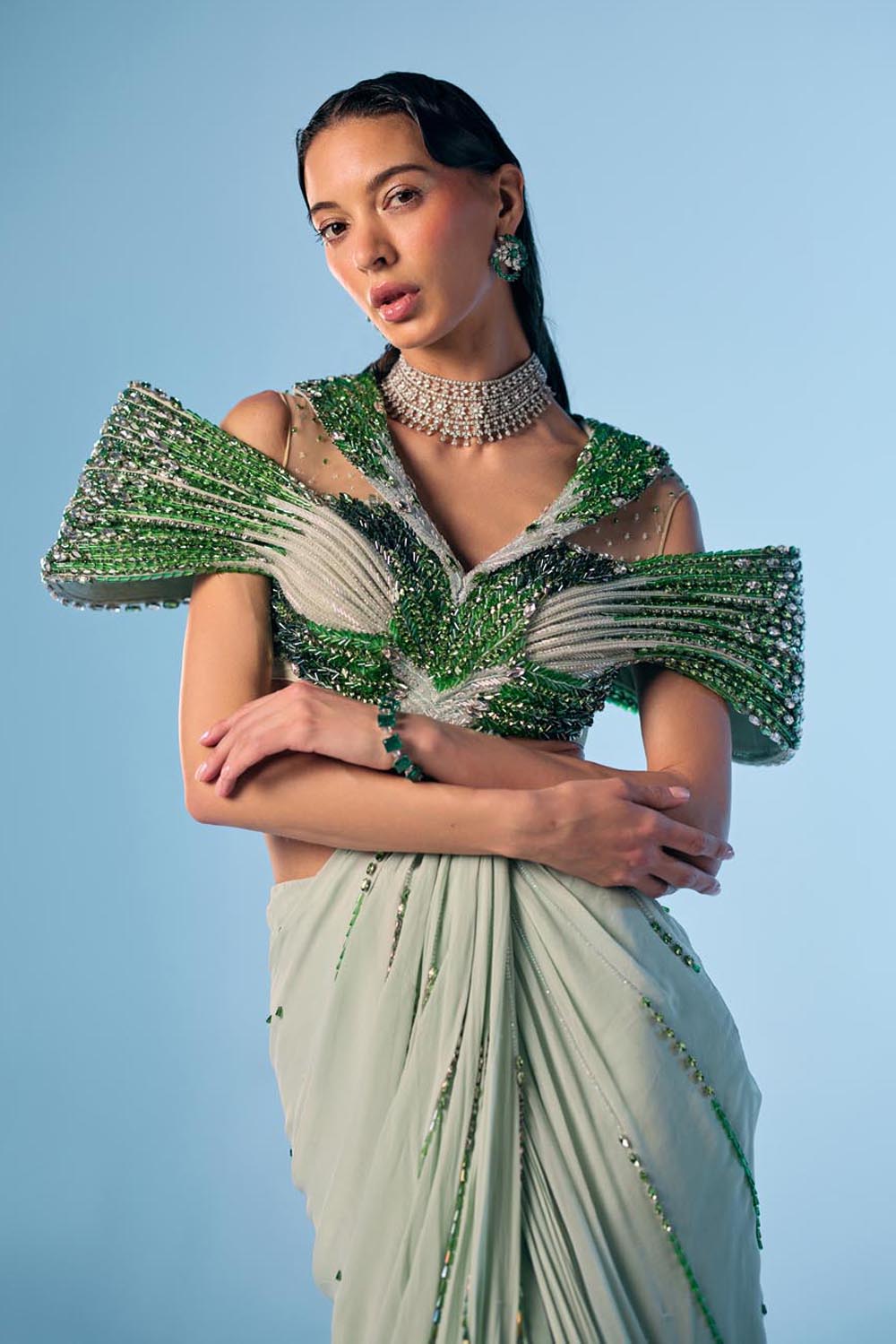 Embroidery: The wing blouse is heavily encrusted with beads, sequins, and crystals in tonal shades of green, creating a textured, reef-like effect. The sheer back yoke is embroidered with delicate bead sprays for transparency and lightness. The saree drape is finished with scattered sequins, placed sparingly to evoke water droplets glistening across the fabric.