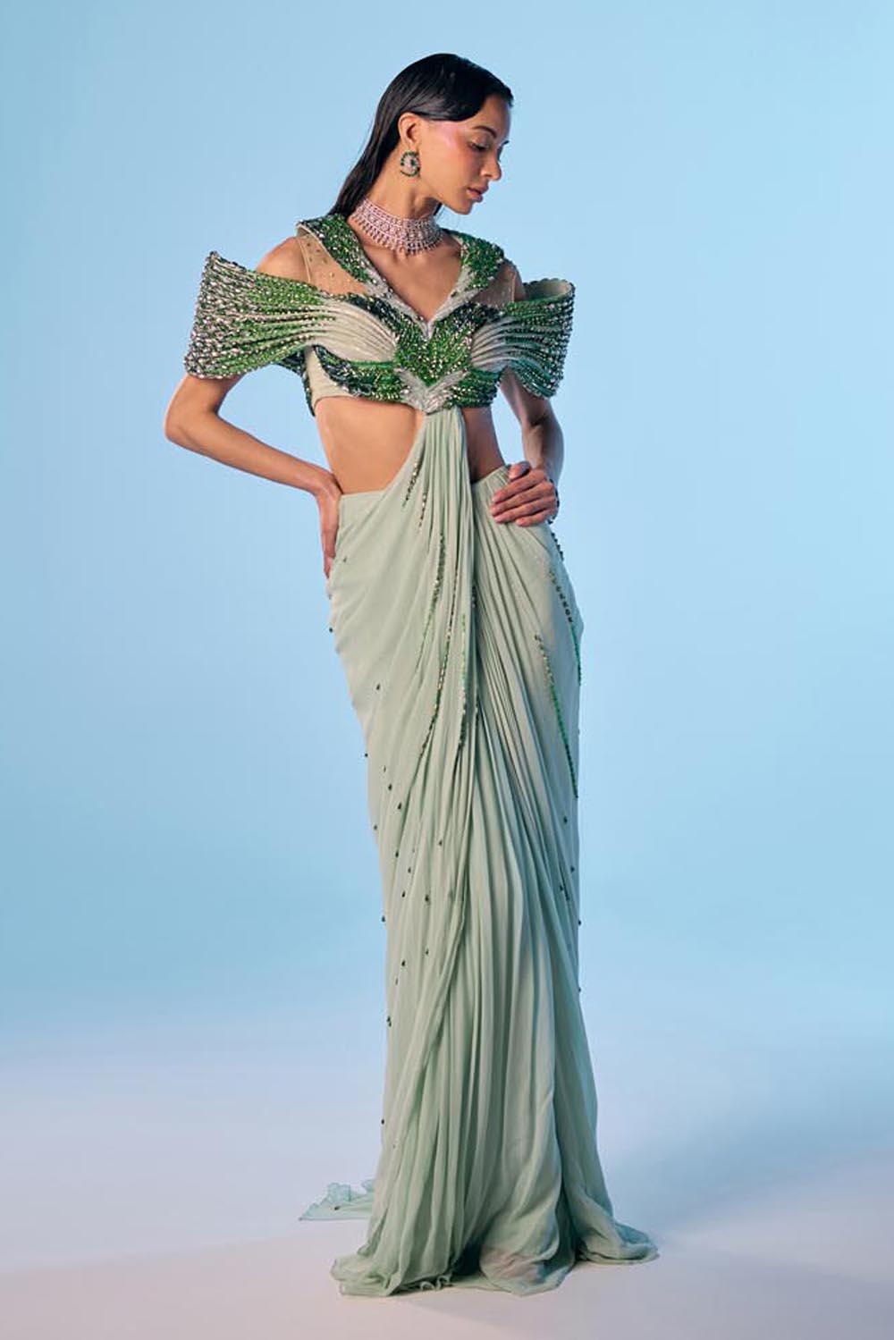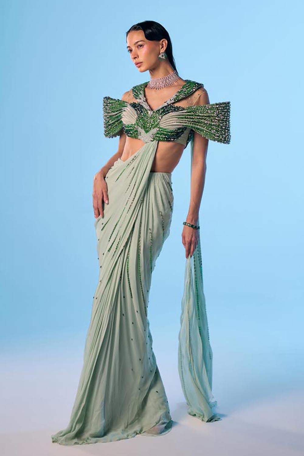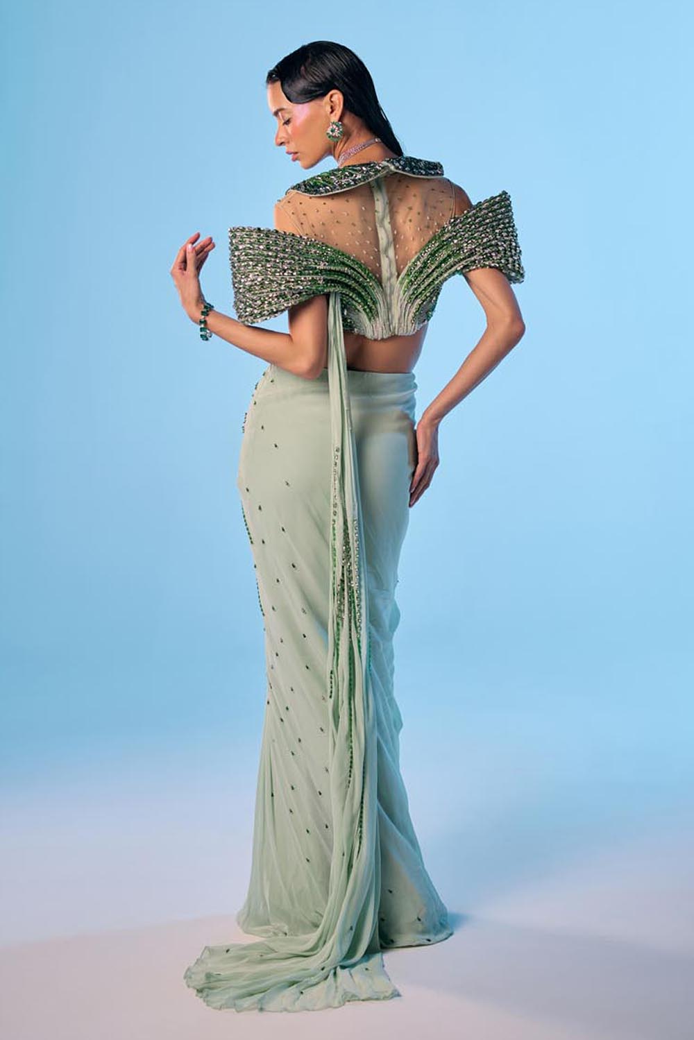 Embroidery: The wing blouse is heavily encrusted with beads, sequins, and crystals in tonal shades of green, creating a textured, reef-like effect. The sheer back yoke is embroidered with delicate bead sprays for transparency and lightness. The saree drape is finished with scattered sequins, placed sparingly to evoke water droplets glistening across the fabric.