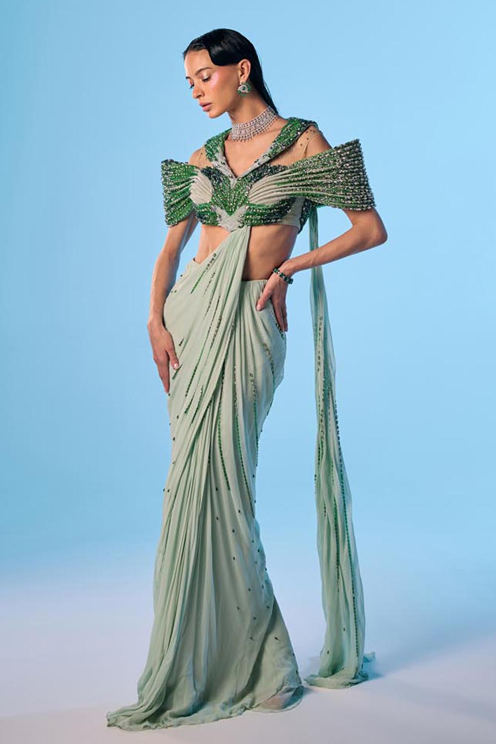 Pastel Green Tide is a Maison H signature of modern couture draping. A sculpted wing blouse, encrusted in shimmering beadwork, crowns the look with architectural drama, while the pastel saree flows in pleated ease, trailing like a soft current. Scattered sequins glisten across the drape, echoing droplets on seafoam. A silhouette that balances bold structure with serene fluidity, it is crafted for the muse who commands attention in quiet yet powerful waves.