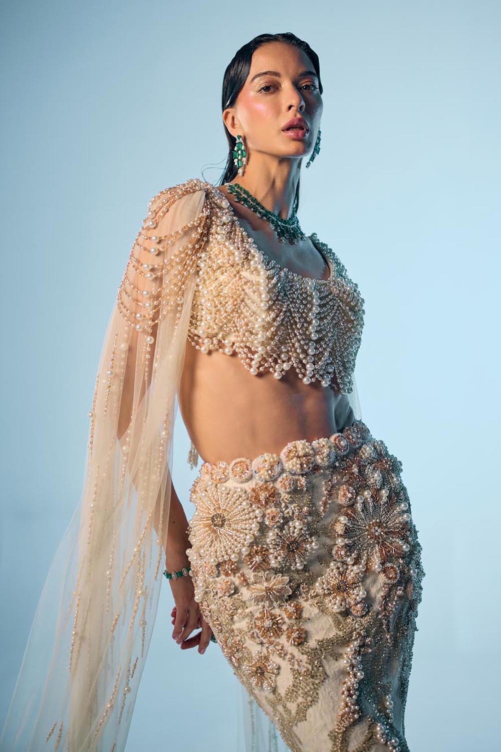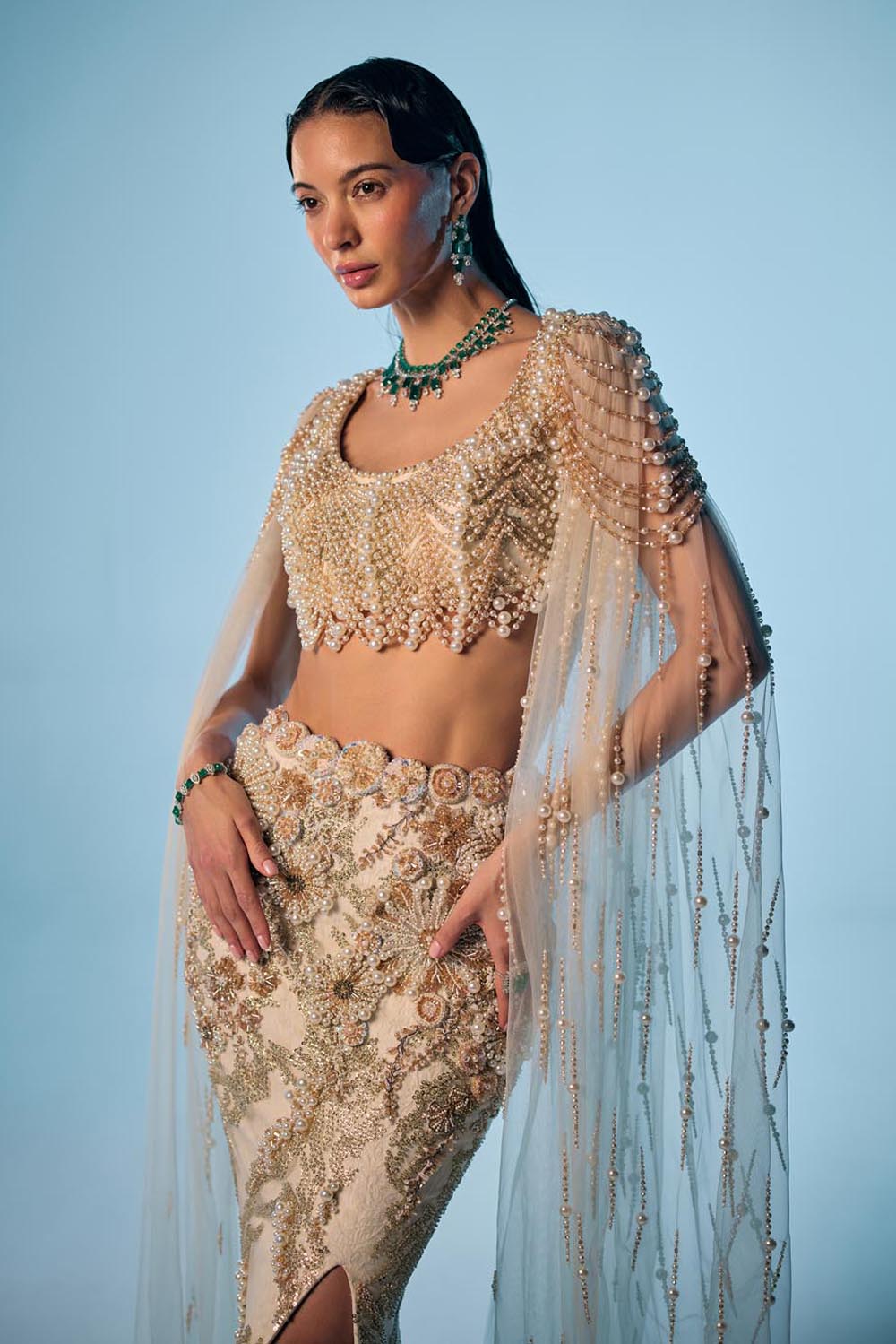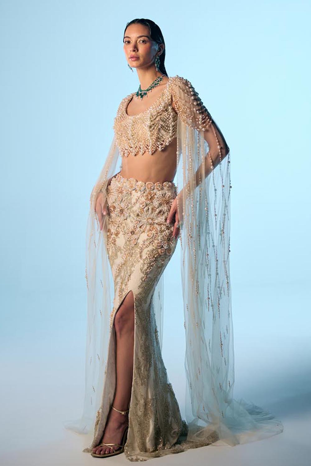 Embroidery: Ivory Gold Drift is Maison H’s whisper of opulence, where delicate strength flows like a tide. A column skirt shimmers with golden floral embroidery, its slit offering both ease and allure. Above, a crystal-edged blouse blooms under a sheer cape that falls like a waterfall, beaded strands glistening as though touched by moonlight. Crafted for the muse who glides through spaces like poetry, this silhouette embodies quiet grandeur and fluid femininity.