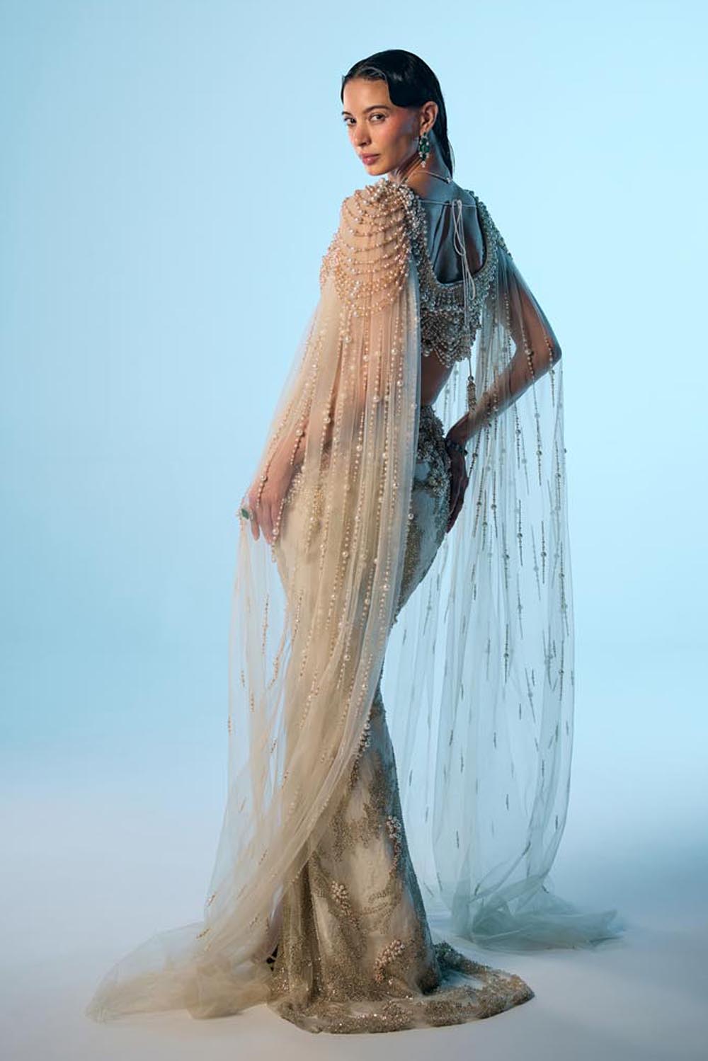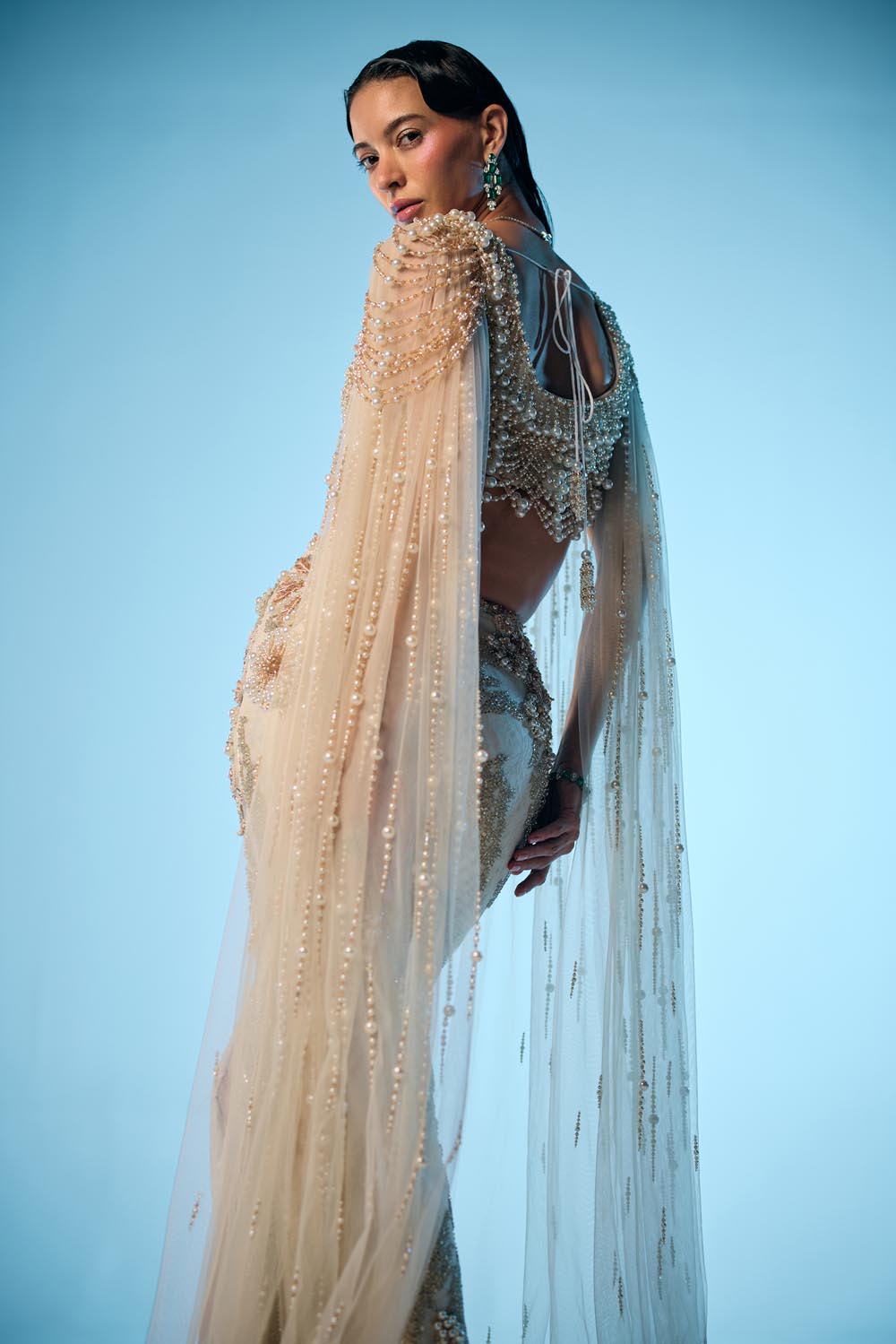 The skirt is richly embellished with three-dimensional floral embroidery in ivory and gold, layered with sequins, beads, and crystals for depth and dimension. The blouse neckline and hemline are highlighted with delicate crystal edging. The sheer cape is embroidered with linear crystal tassels and scattered beads, catching light like falling water droplets.