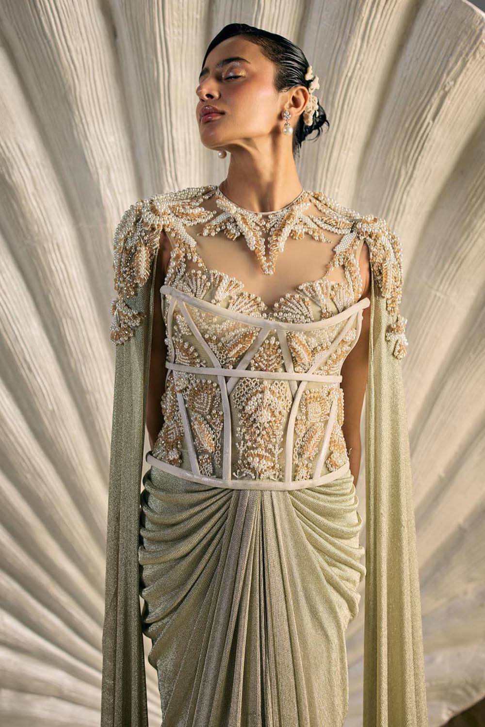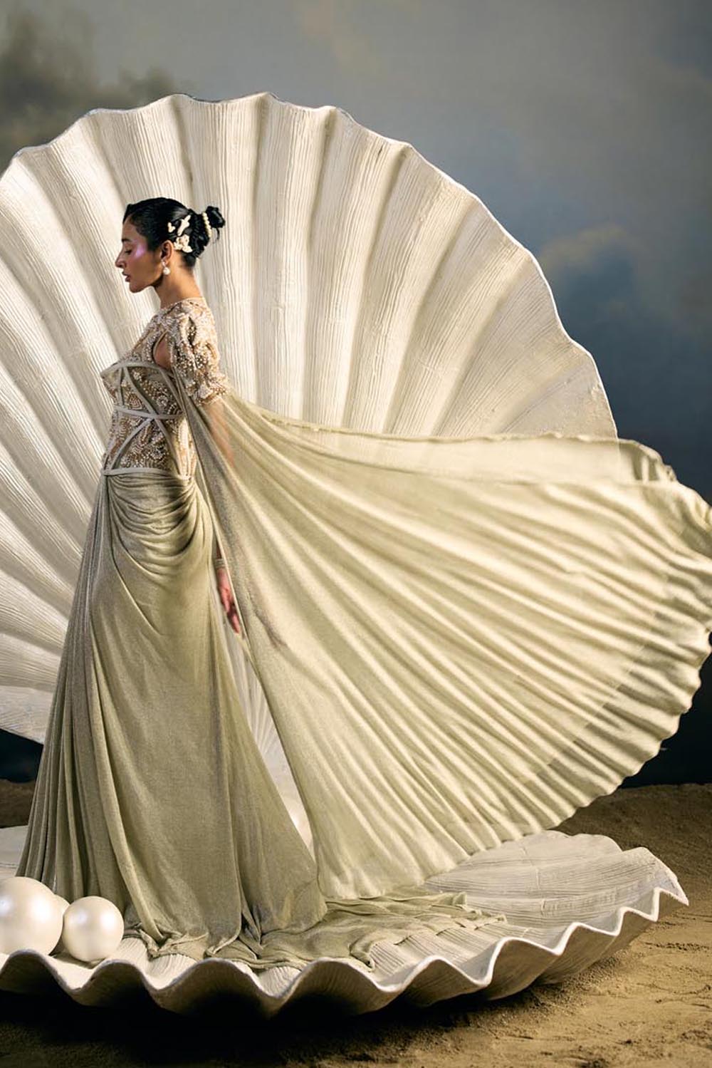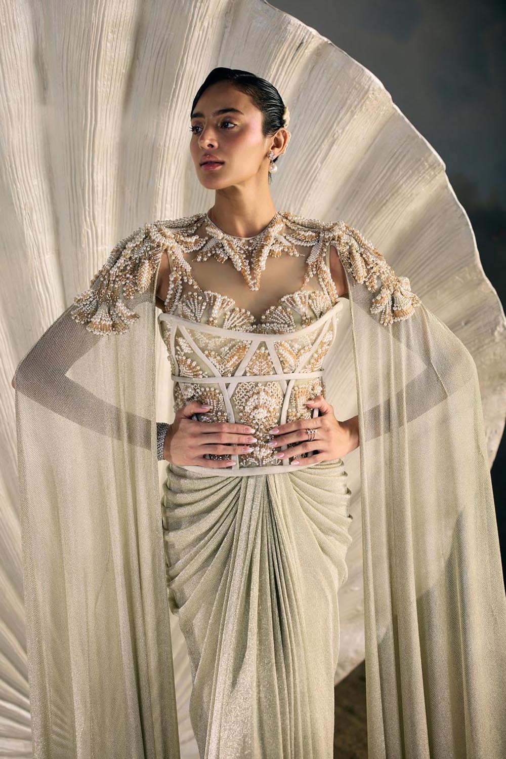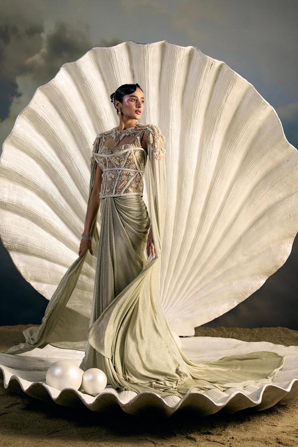 Embroidery: Intricate bead and sequin embroidery inspired by oceanic corals and shell lattices, rendered in linear cascades across the trousers and panels. The bodice is highlighted with encrusted crystal detailing that frames the waistline and blossoms outward, echoing sea flora.