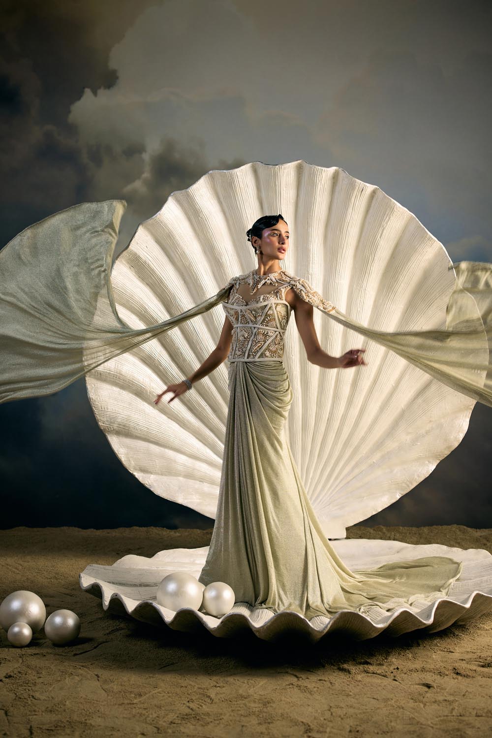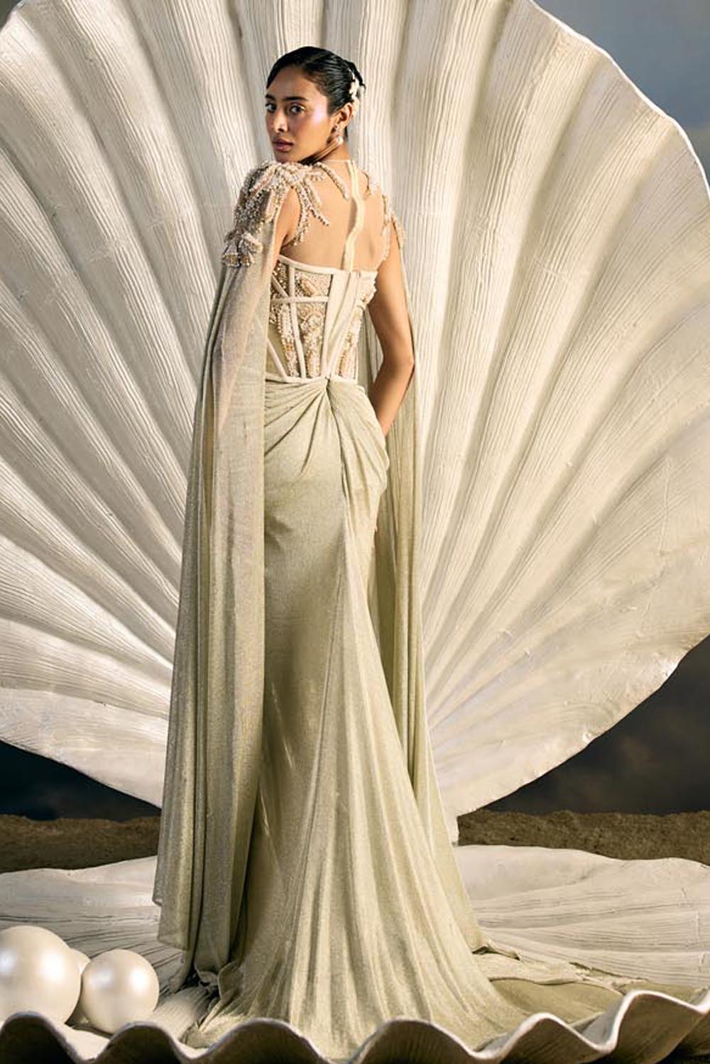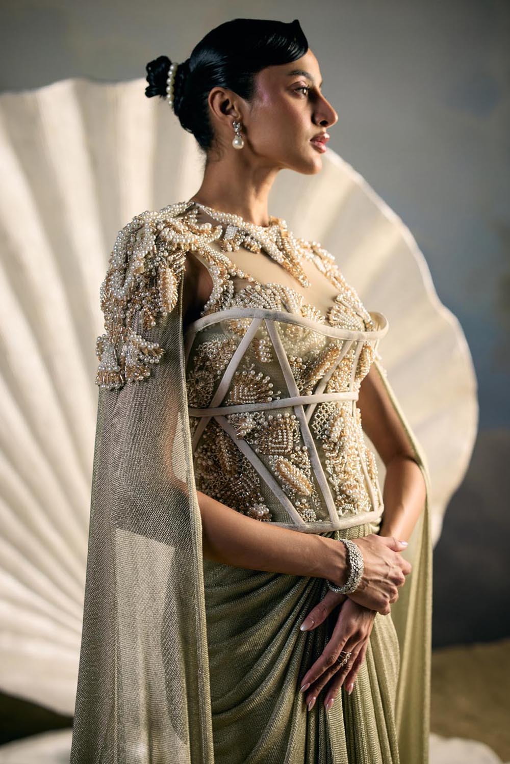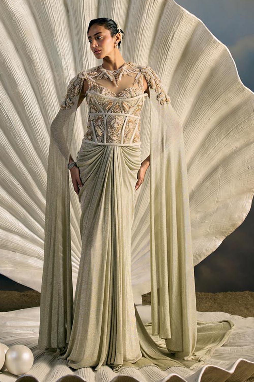 Embroidery: Intricate bead and sequin embroidery inspired by oceanic corals and shell lattices, rendered in linear cascades across the trousers and panels. The bodice is highlighted with encrusted crystal detailing that frames the waistline and blossoms outward, echoing sea flora.