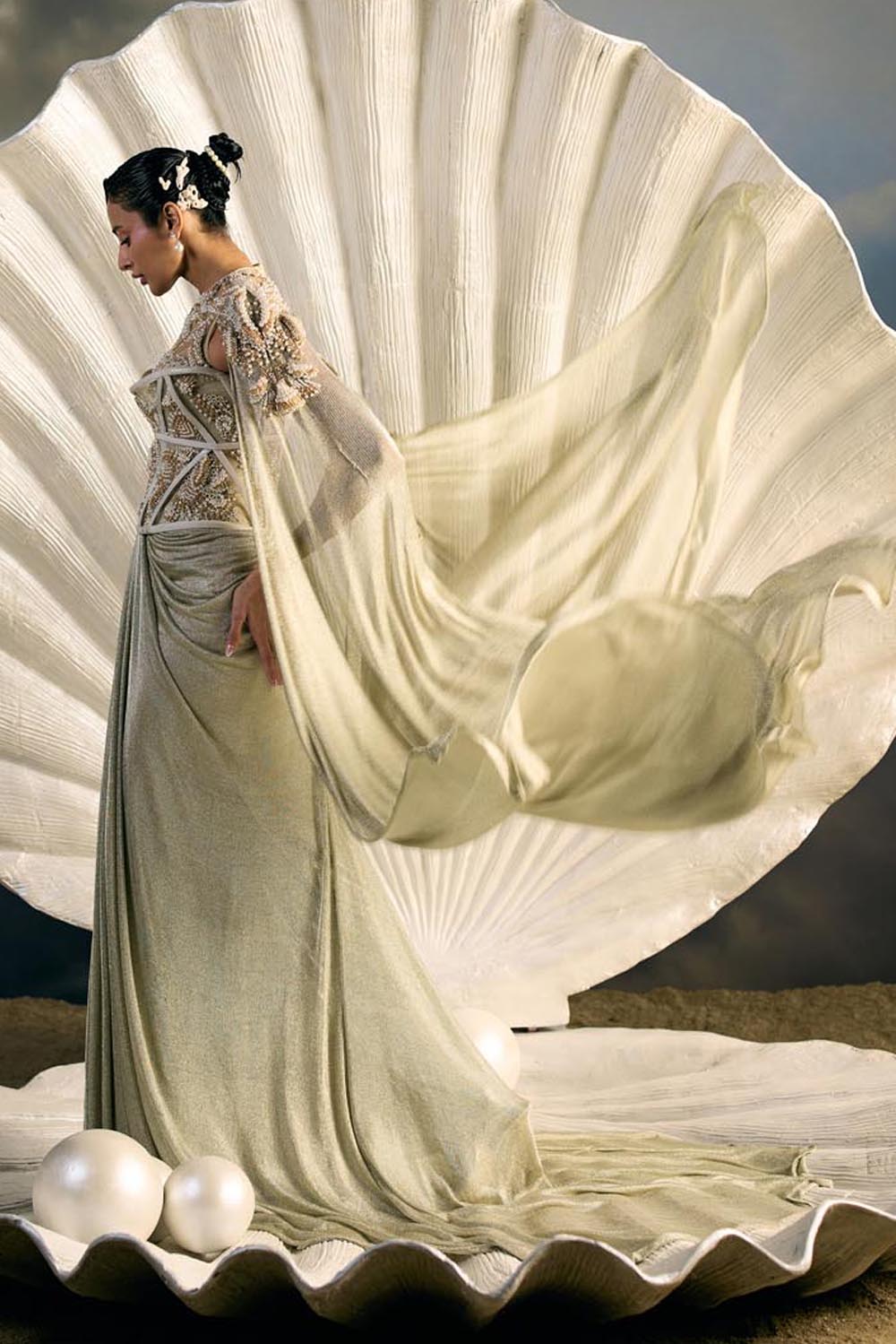 A Maison H couture statement, this pastel seafoam pant-gown marries structure and fluidity. A peplum-inspired blouse with a crystalline waist accent extends into cascading panels, embroidered in shell-lattice motifs. Straight trousers balance the dramatic drape, while the trailing panels shimmer with sequins and beads, evoking underwater elegance. Designed for the modern muse, it is a look that commands presence with effortless sophistication.