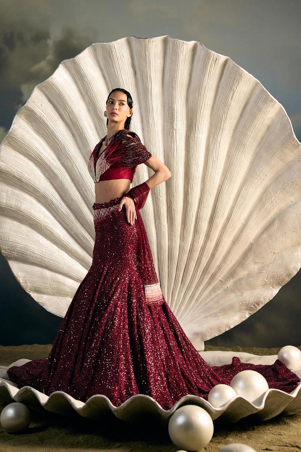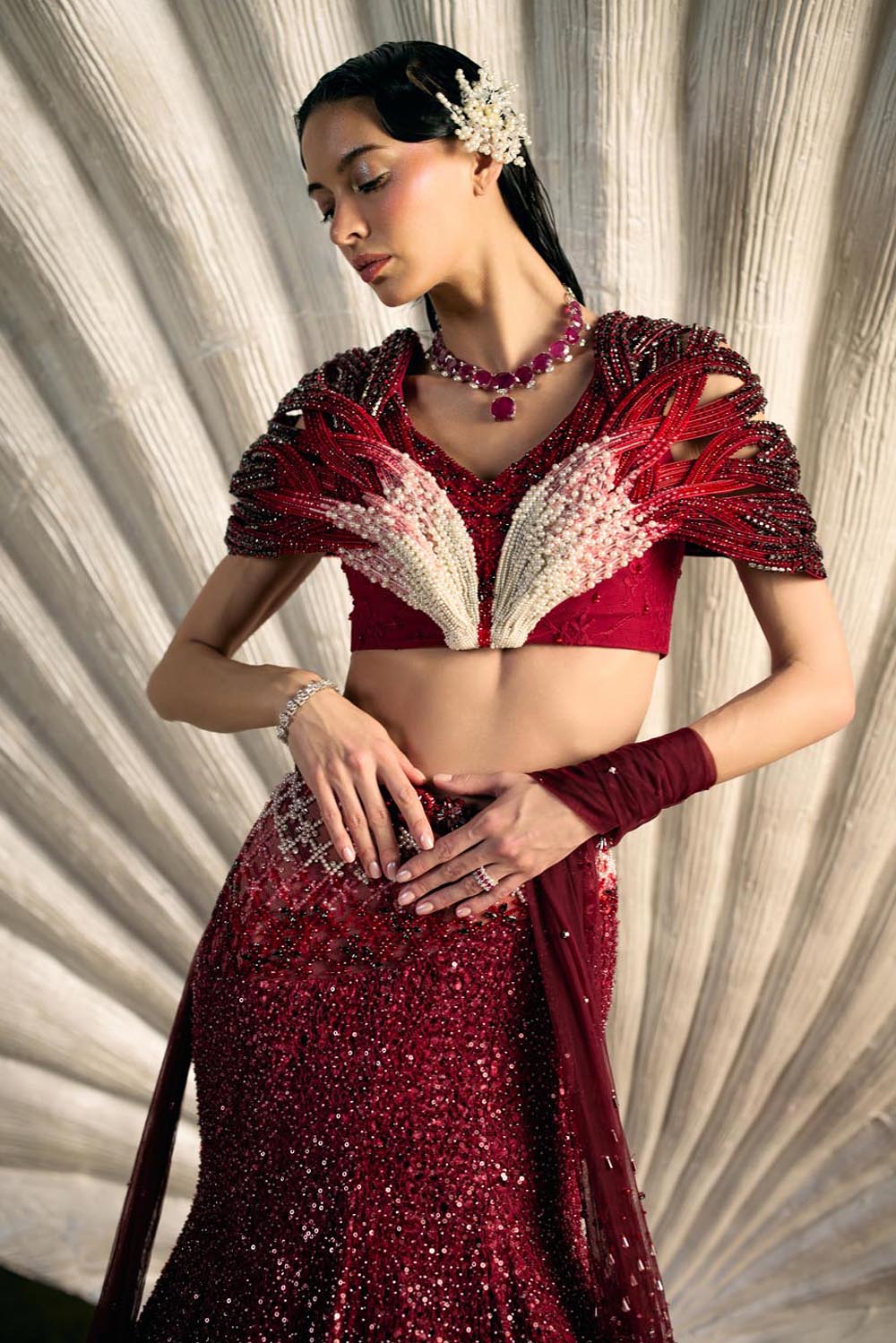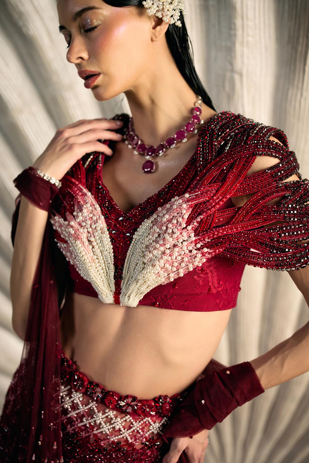 Embroidery: The lehenga features ombré embroidery, transitioning from deep rouge at the waist to luminous white pearl at the hem through layers of sequins, beads, and crystals. The wing top mirrors this shimmer with structured embroidery, while the peekaboo waistline is delicately framed with crystal embellishments, adding depth and intrigue.