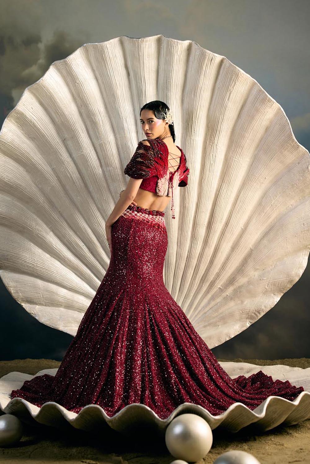 Rouge Reef Ombré captures the Maison H essence of drama and precision. A sculpted wing top crowns a fishtail skirt embroidered in an ombré gradient from crimson richness to pearl-toned brilliance, like waves dissolving into light. Peekaboo waist details heighten the allure, giving the silhouette both sensuality and strength. Designed for the muse who thrives on commanding presence, this is couture at its boldest and most luminous.
